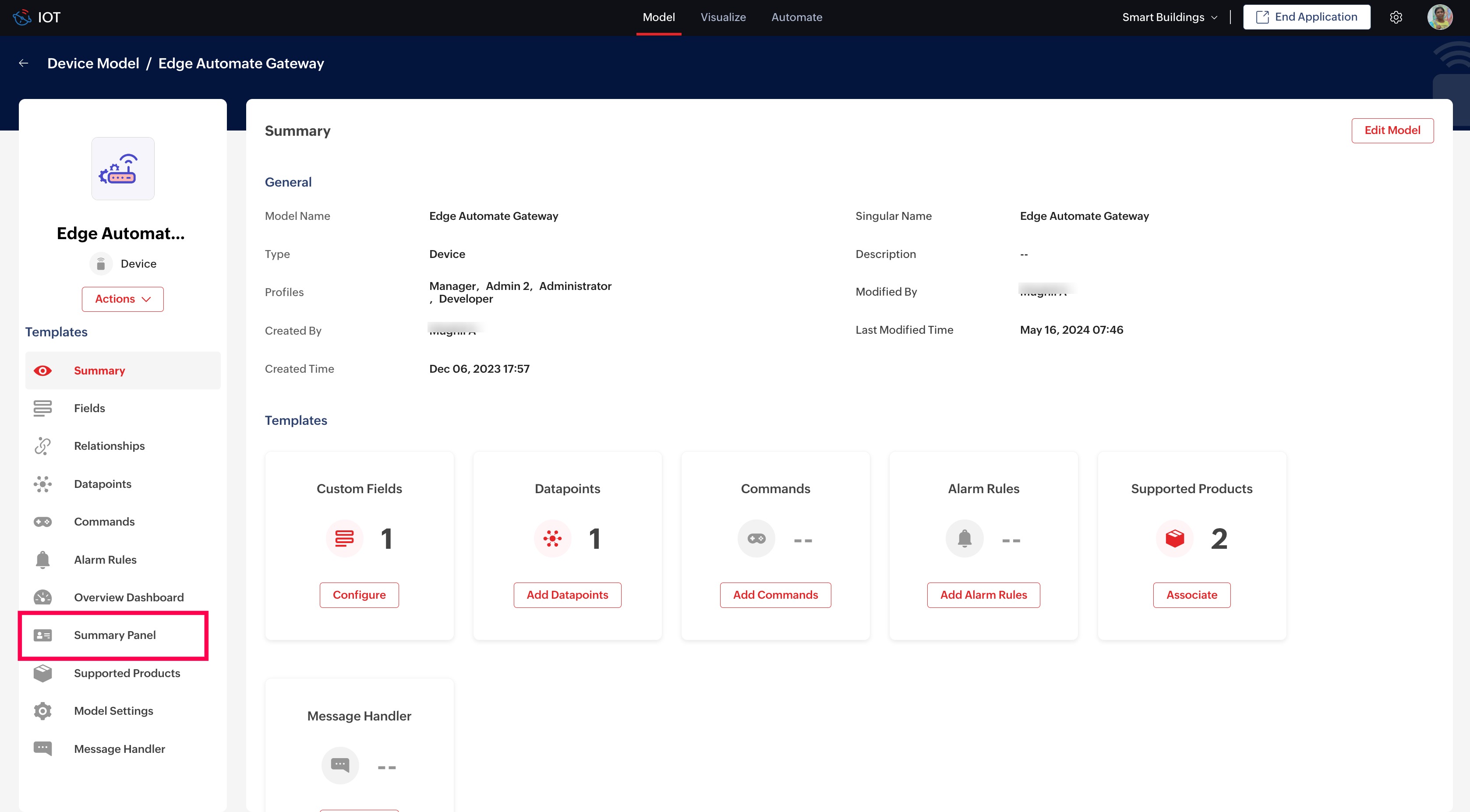 The Summary Panel in Zoho IoT presents essential information of a managed entity (