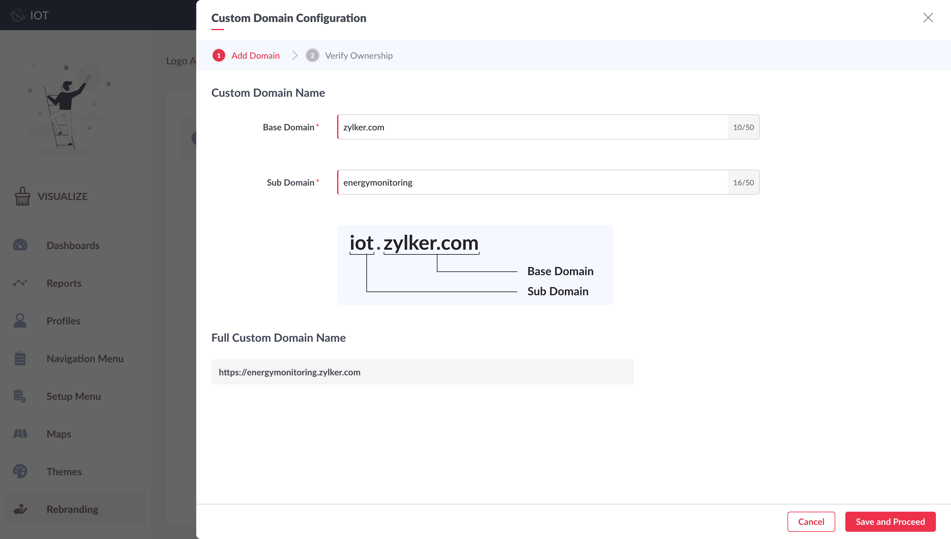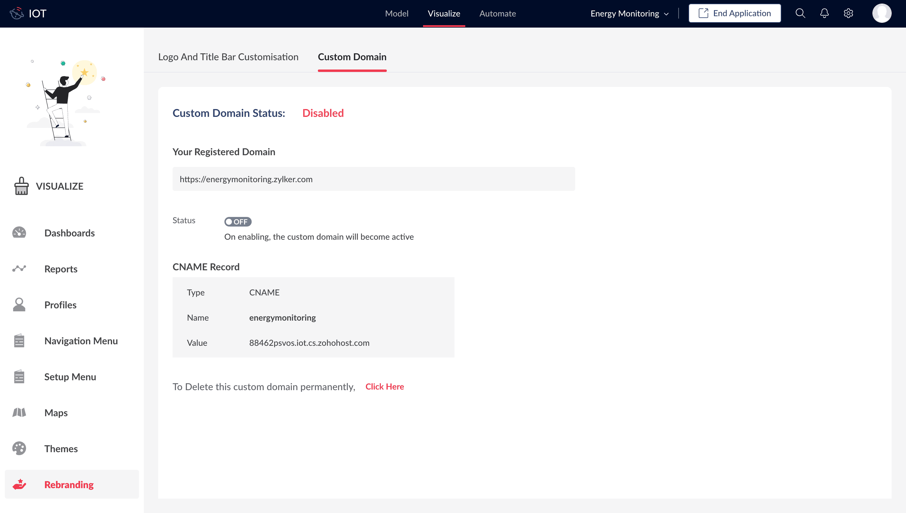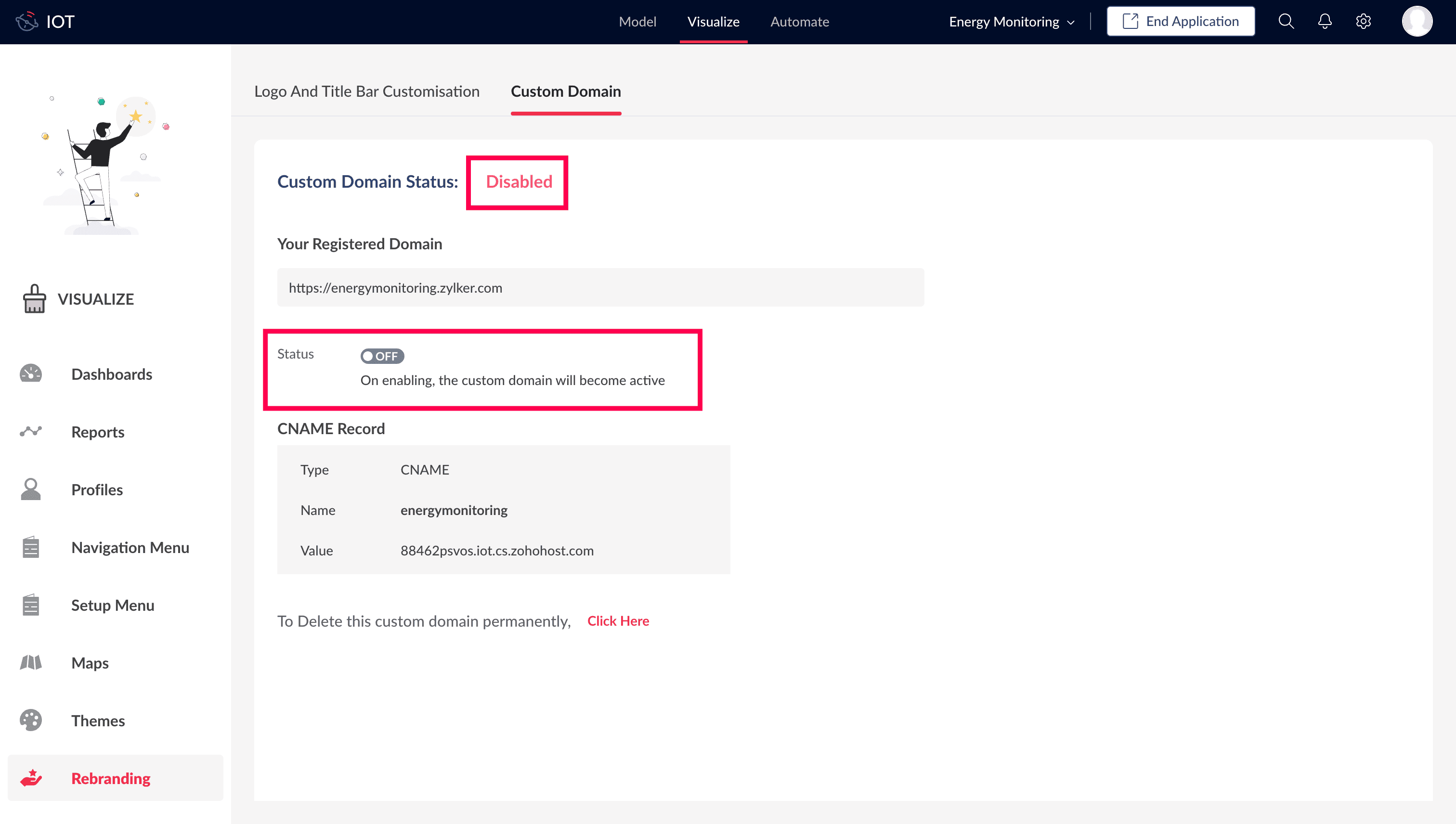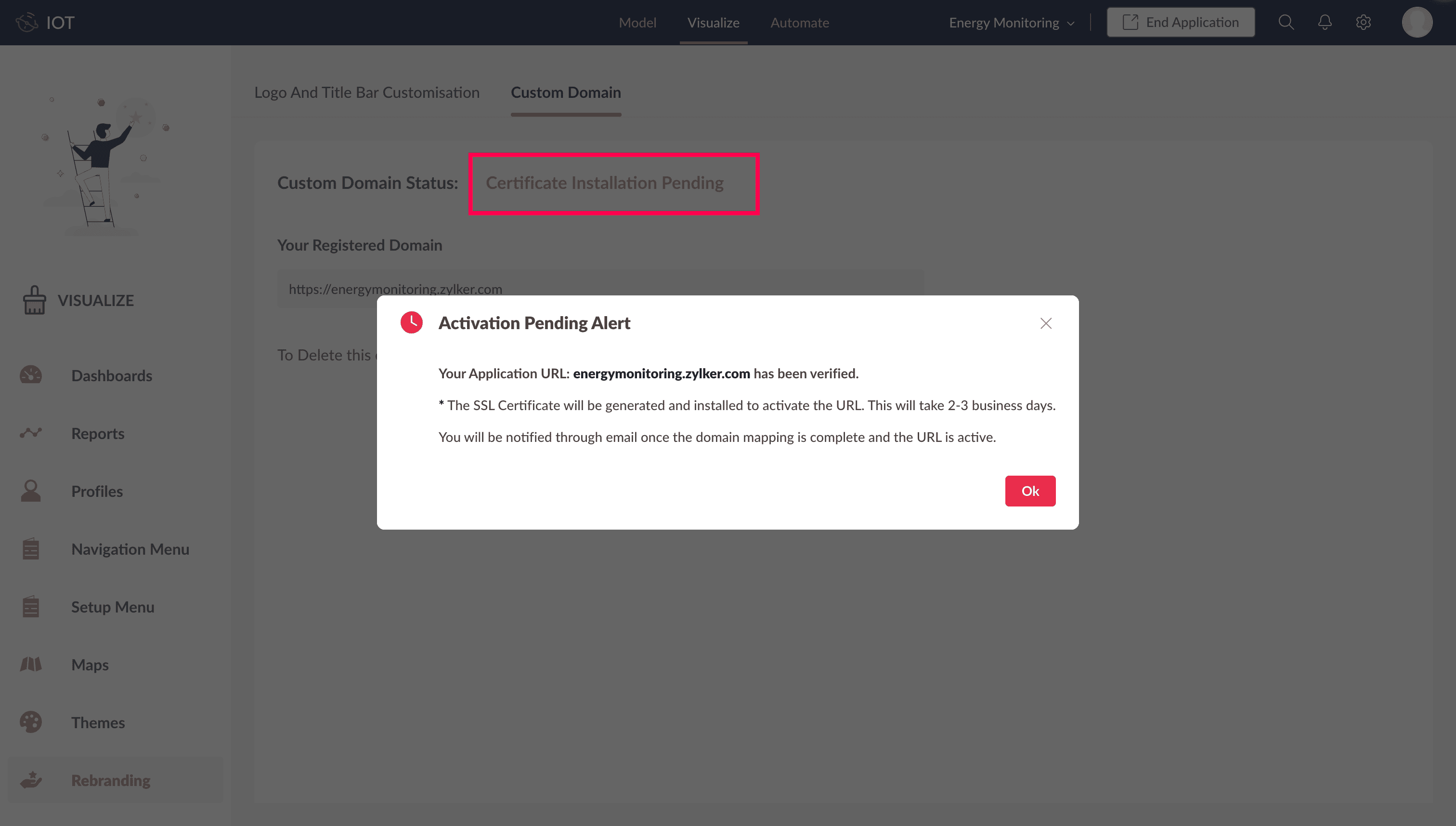 Image: Activation Pending alert is displayed after verification is passed.Note: Once verified, the SSL certificate generation and deployment process will be initiated, and you will receive a mail with subject "Custom Domain energymonitoring.zylker.com has been Verified". And a second mail with subject "SSL Certificate Request".Within 2-3 days, the SSL certificate will be installed, and you will receive a mail with subject "Custom Domain <domain url> is now Active and Secure." and the same will be reflected in the Custom Domain Configuration page.
