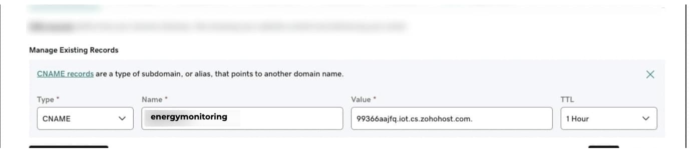 2. Go to the DNS Management page of your domain provider and create a CNAME record by providing the copied name and value as given below.