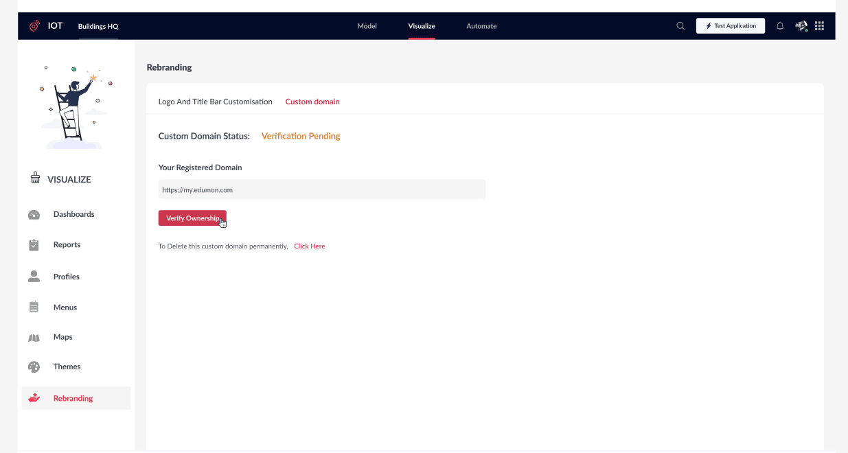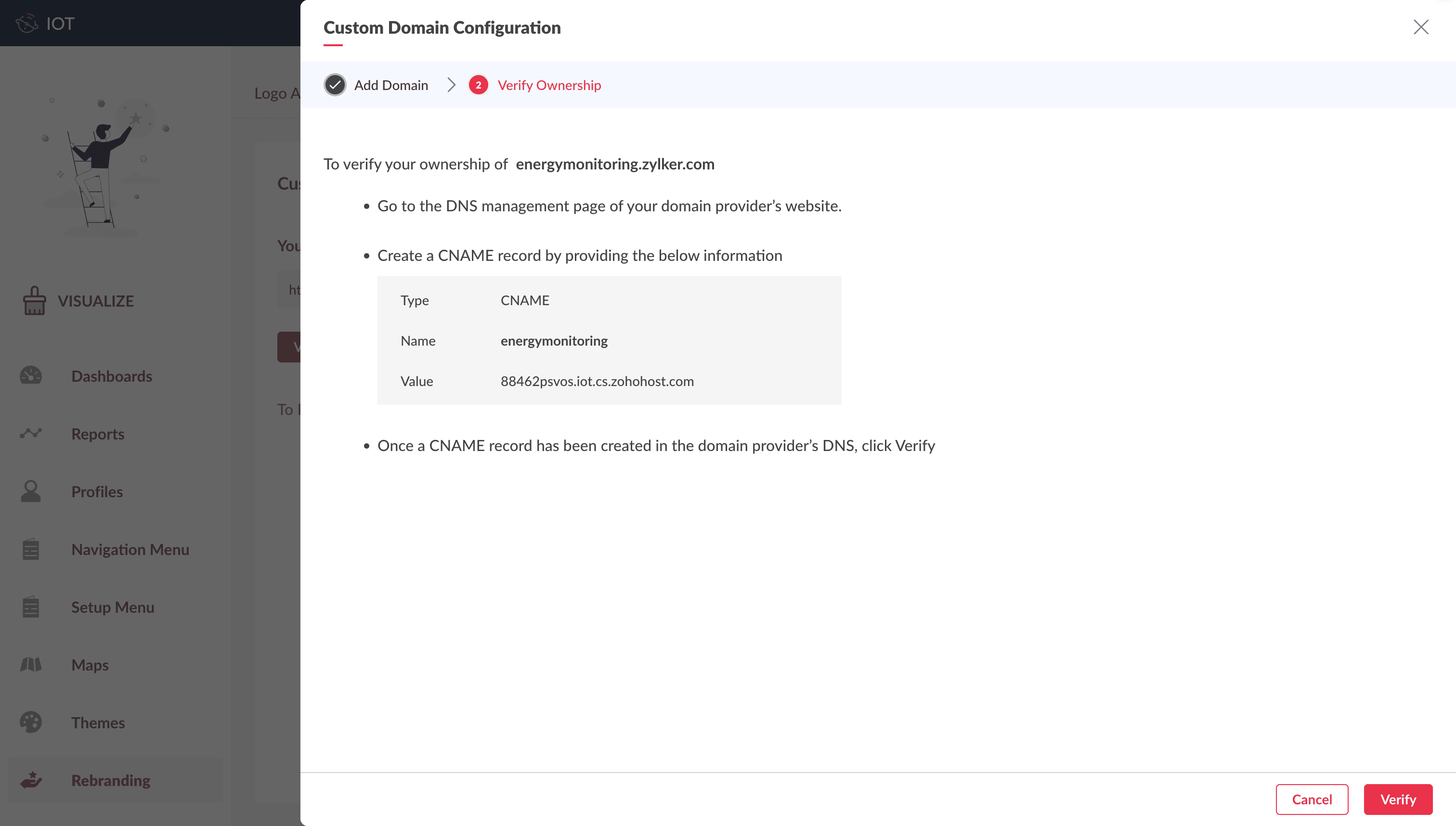 3. Once the CNAME record is created in the DNS Management page, Click Verify in the Verify Ownership tab in the application.4. If the verification fails, the Custom Domain status remains as "Verification Pending" and the Verification Pending Alert is displayed.