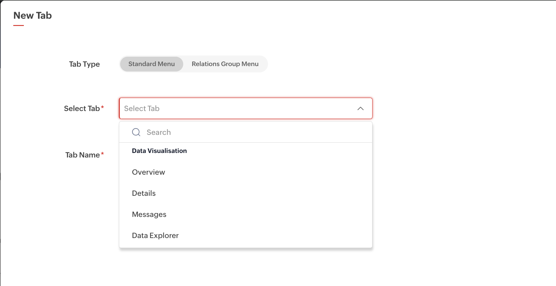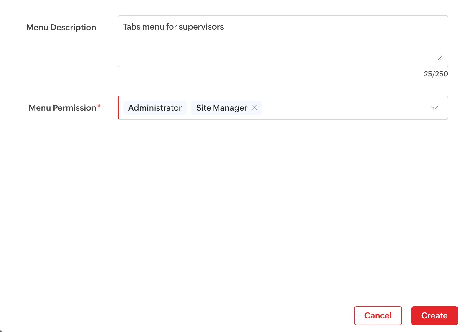 Existing and newly created tab menus can be mapped to profiles using the Tab Menu Permissions option. During tab menu creation, the profiles selected under Menu Permissions will have the corresponding tab menus available for selection in the dropdown.