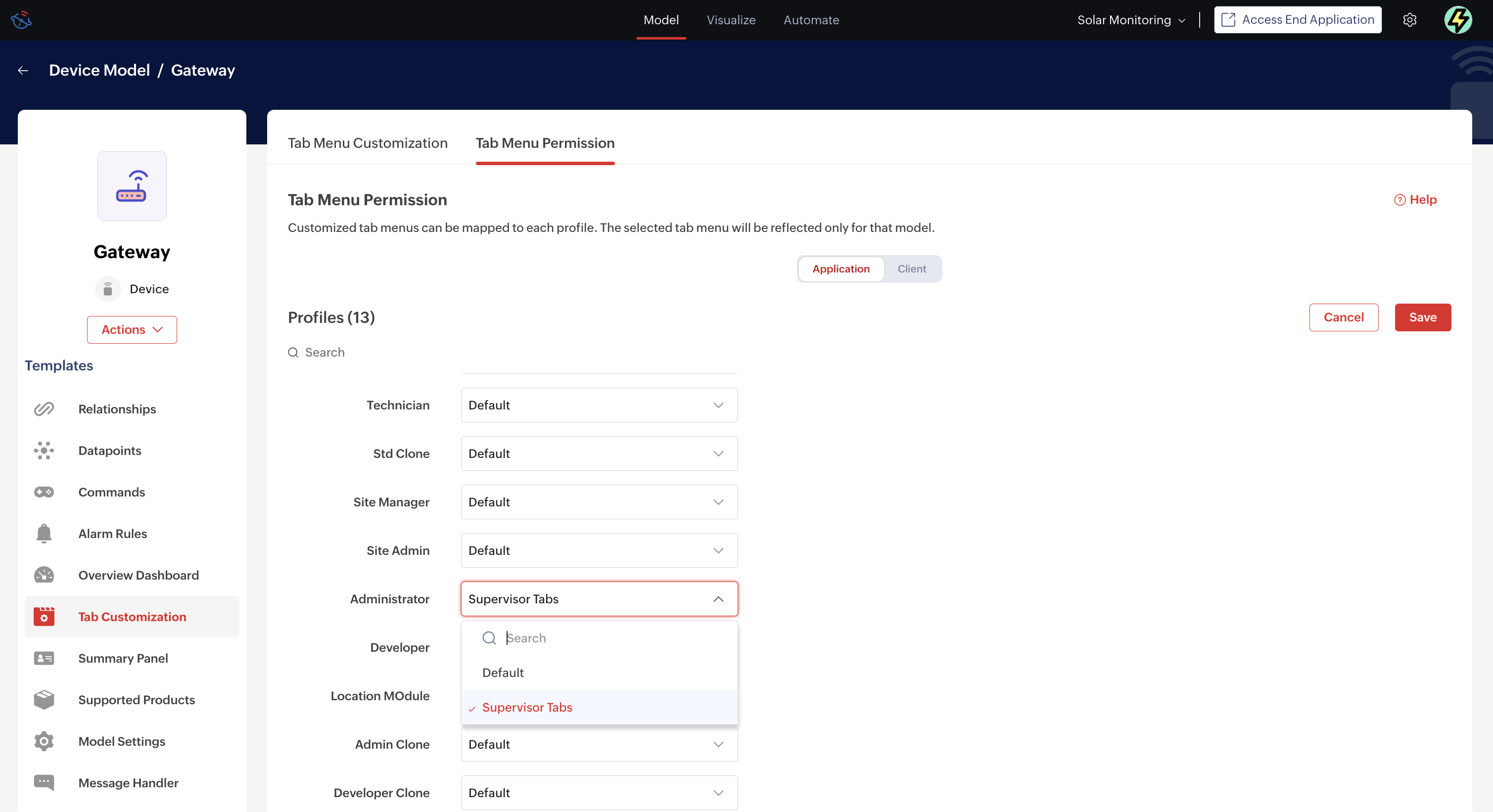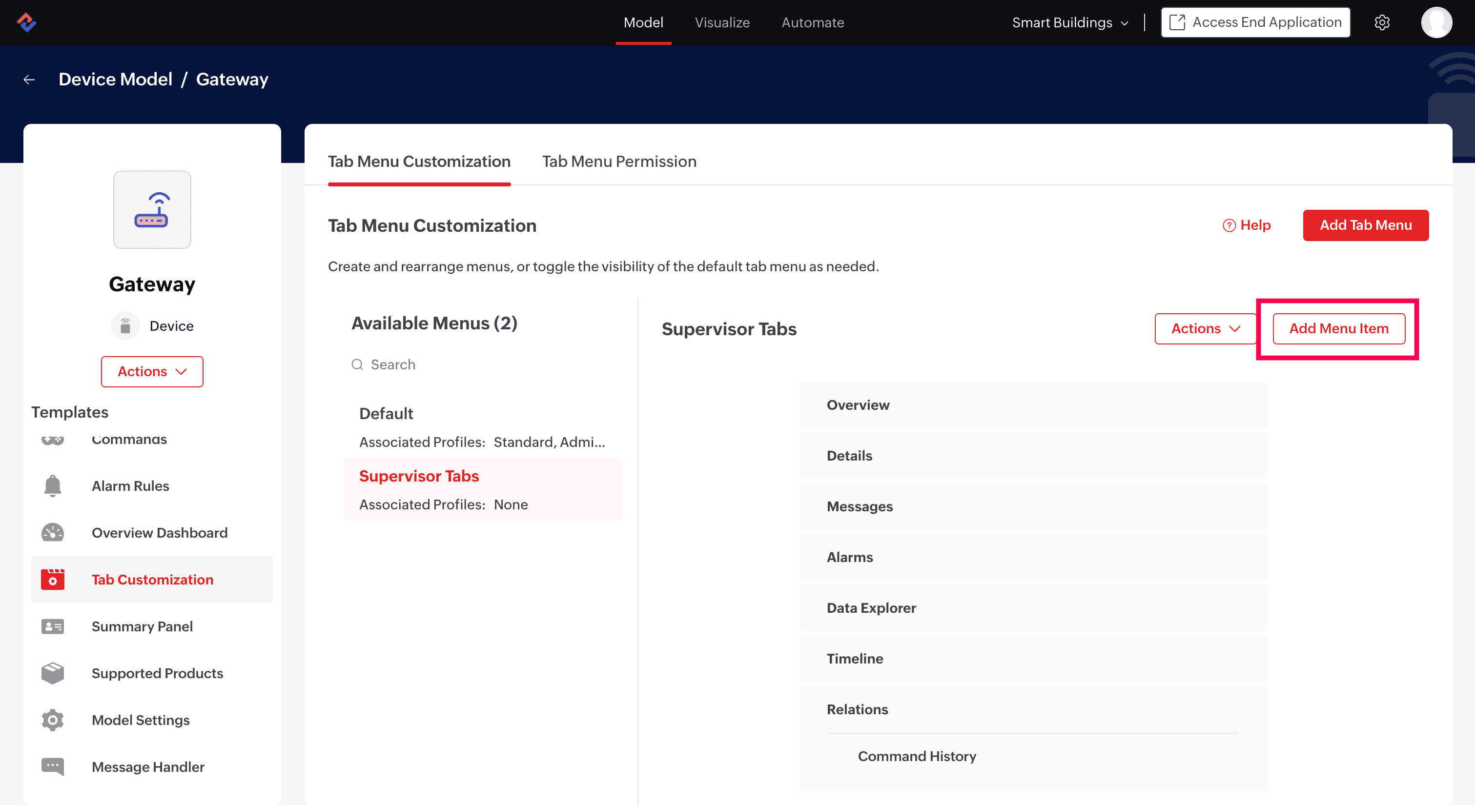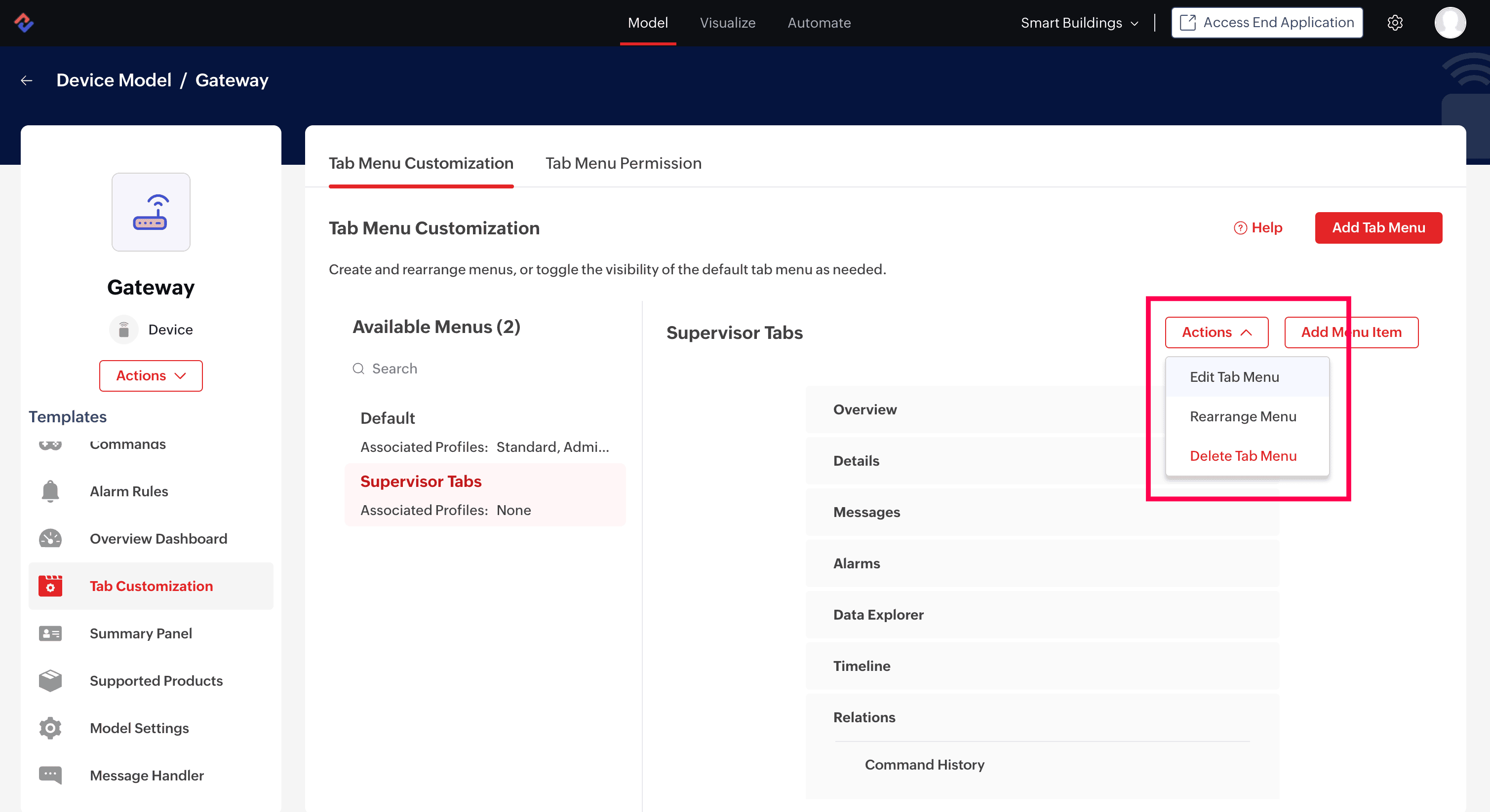 To customize the tabs of the above managed entity, the tabs menu of the model Gateway must be modified.