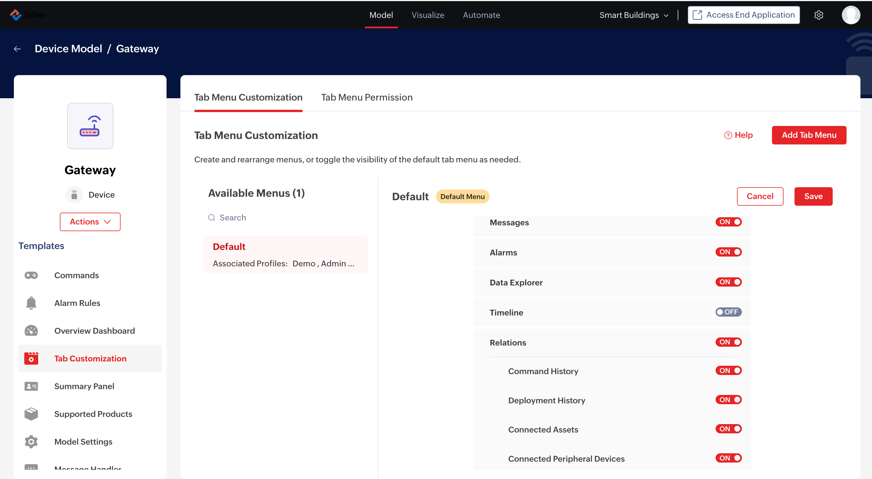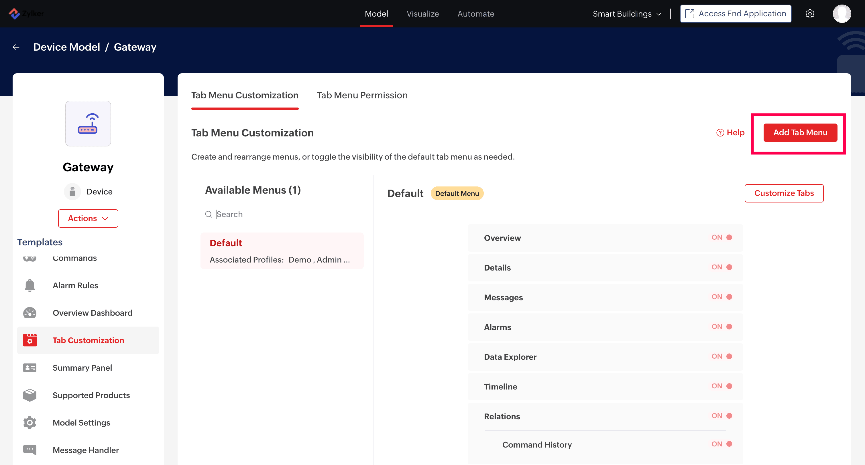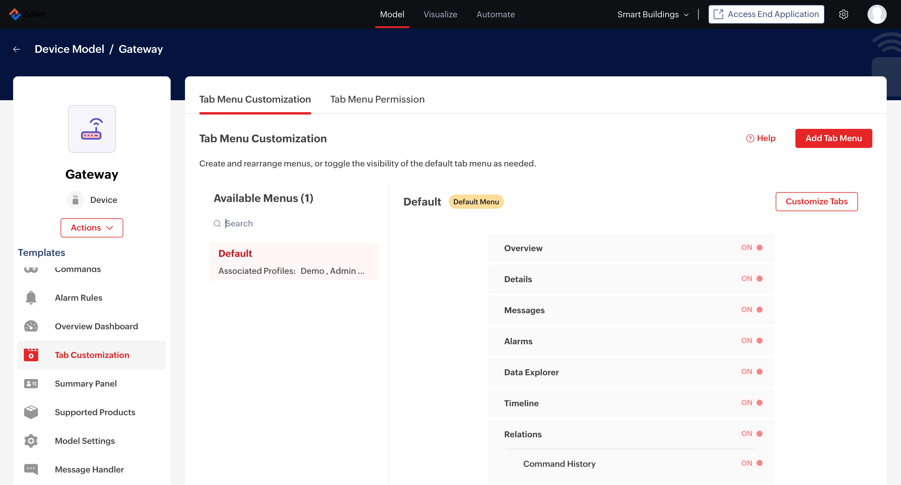 In the Zoho IoT application, tab menus are used to display different information of a managed entity. Tab menus are configured at the model level, and reflected to all managed entities of the model. Each model includes a default tab menu that is displayed by default on accessing the information screen of the entity.