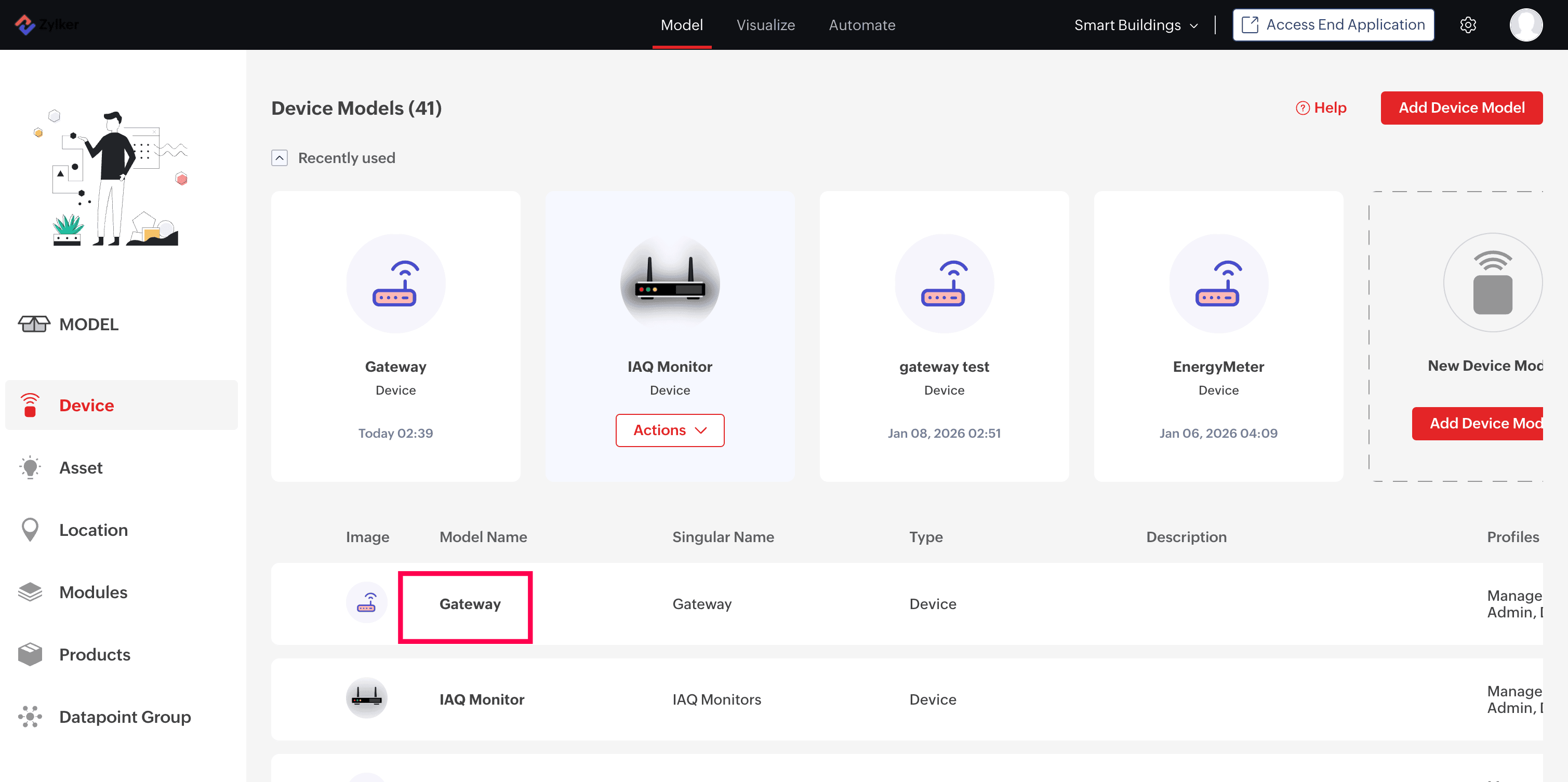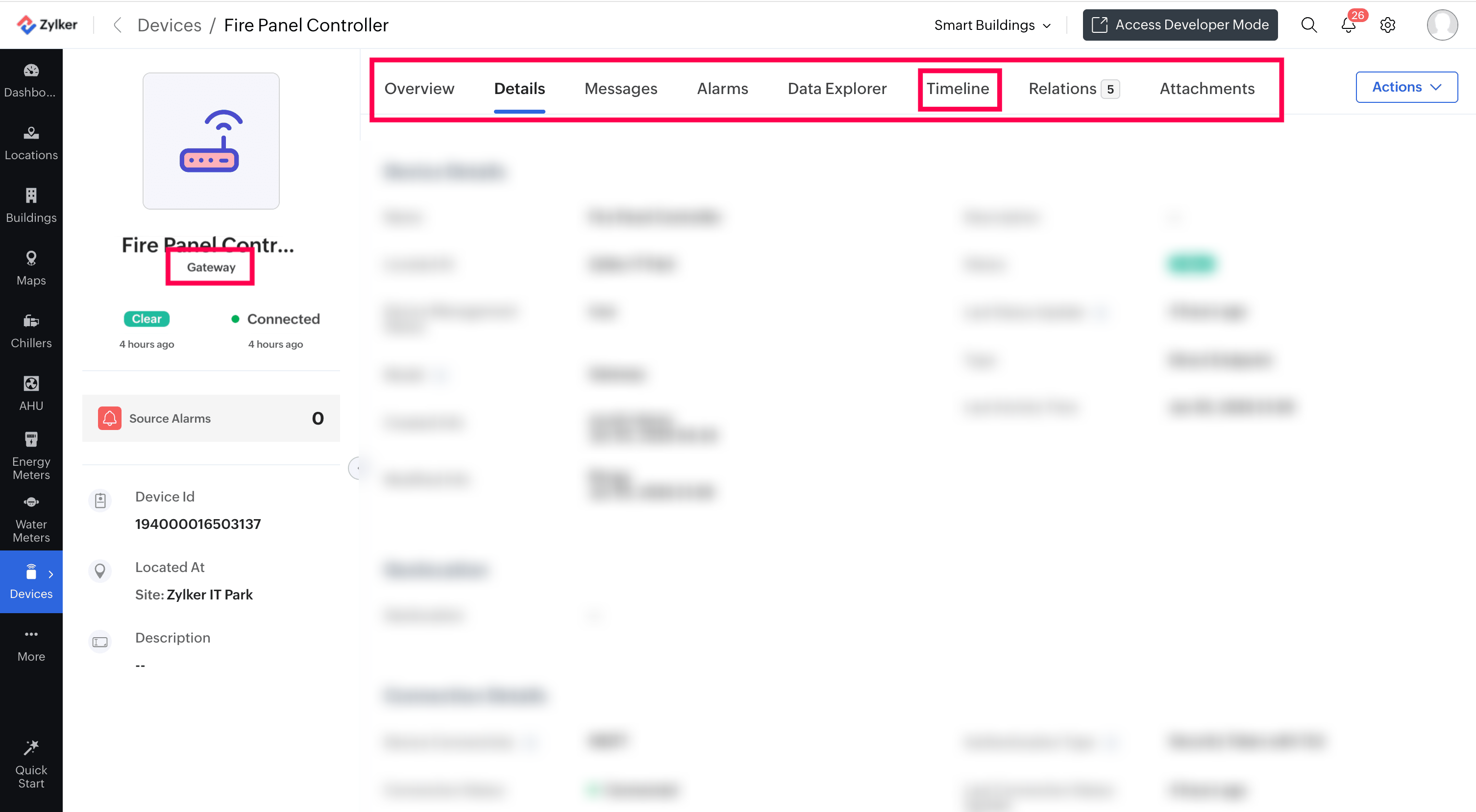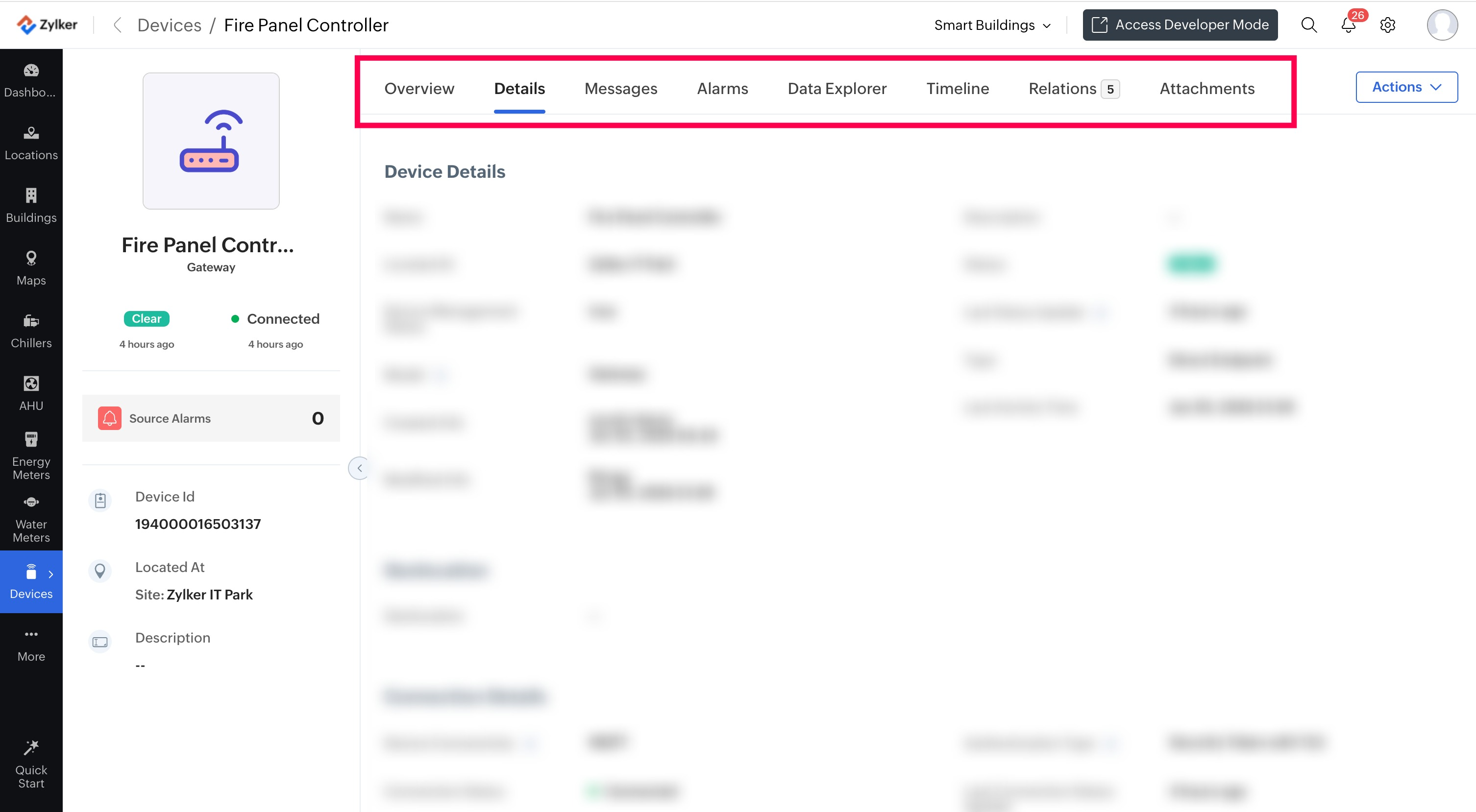 In the Zoho IoT application, tab menus are used to display different information of a managed entity. Tab menus are configured at the model level, and reflected to all managed entities of the model. Each model includes a default tab menu that is displayed by default on accessing the information screen of the entity.