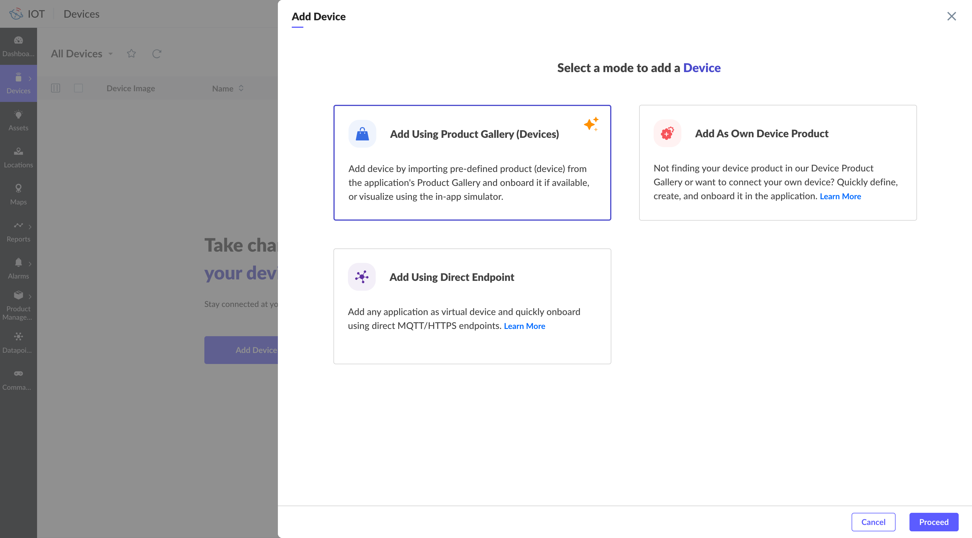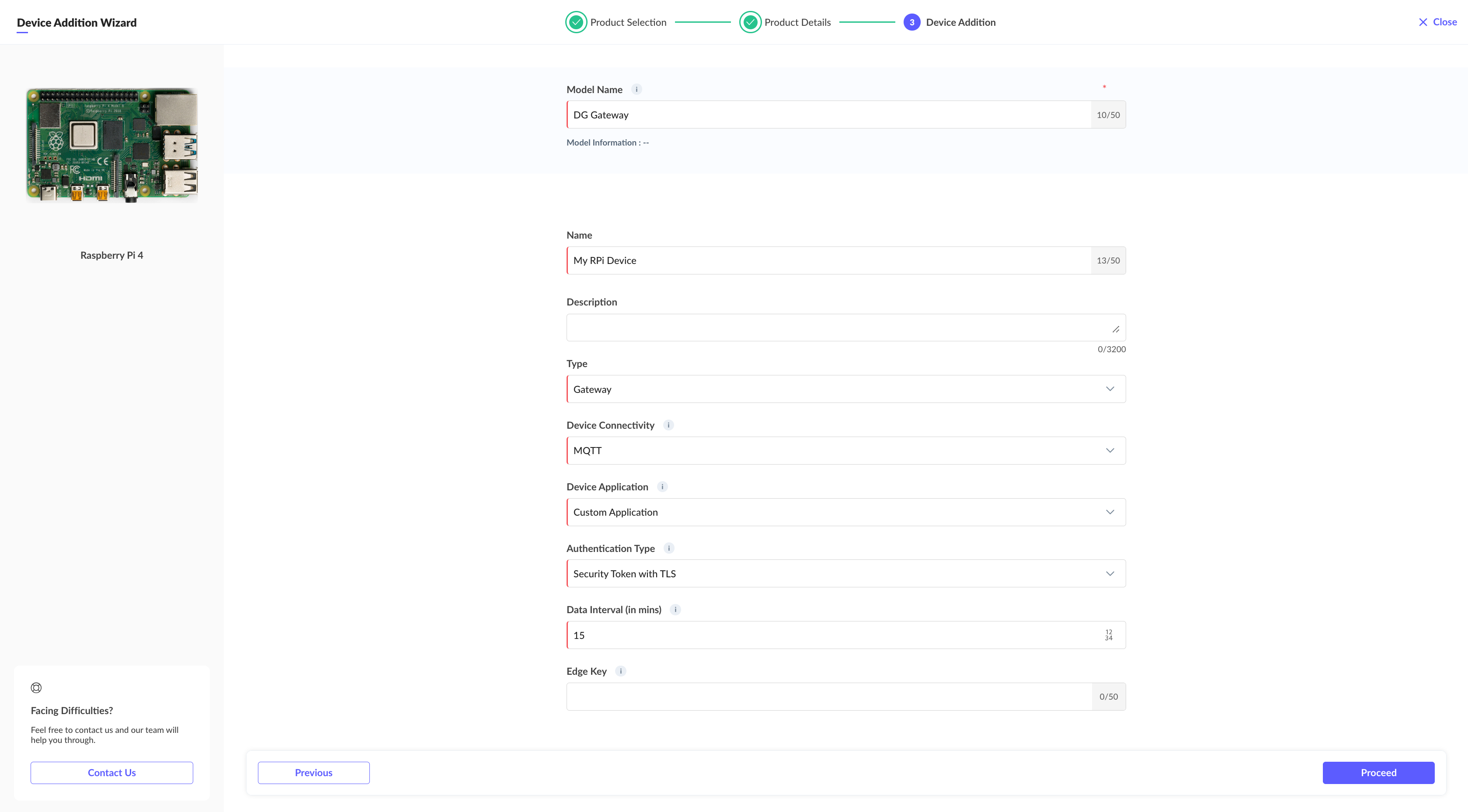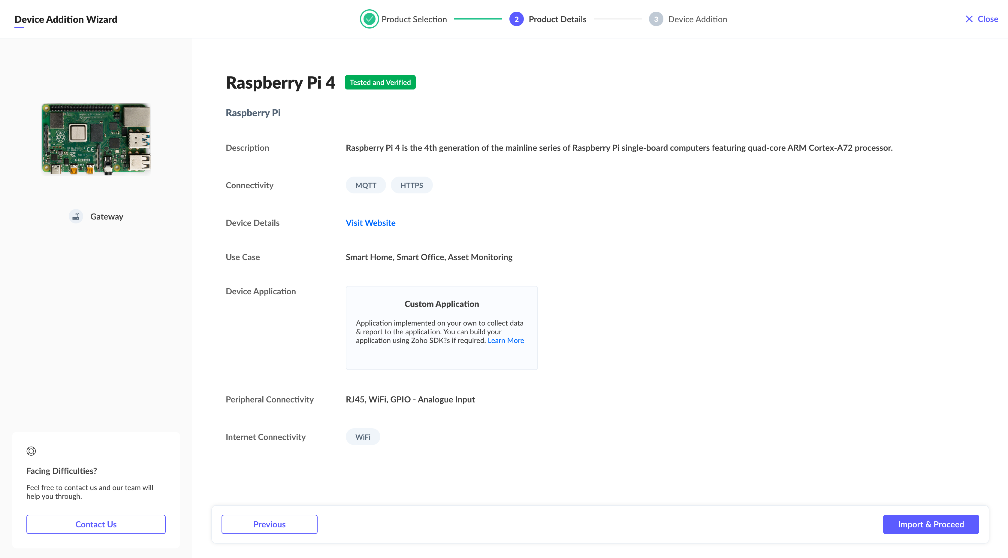 1. Access the End Application. (By default, you will land in the End Application, which is given below; or else, click End Application in the top-right corner of the screen.)2. Select Devices > Devices in the left pane.3. Click Add Device.3. Select Add Using Product Gallery (Devices) and click Proceed.4. Select Raspberry Pi 4 and the Device Addition Wizard will appear.5. Click Import & Proceed.6. Click the toggle to Create New Model.7. Provide the following information.