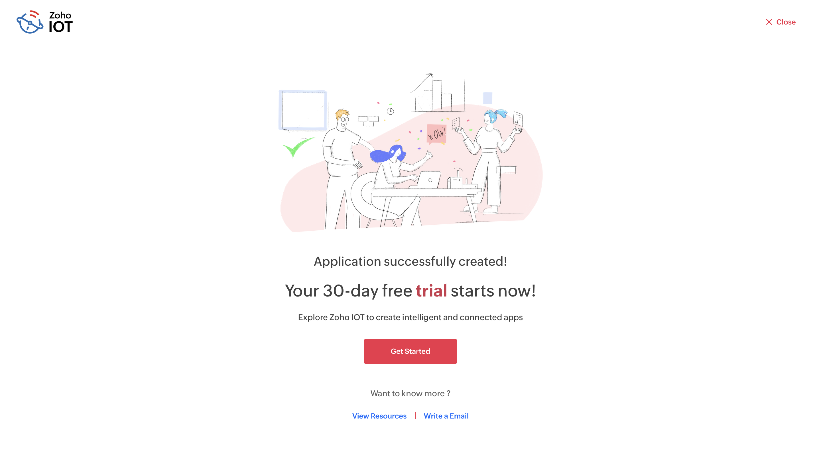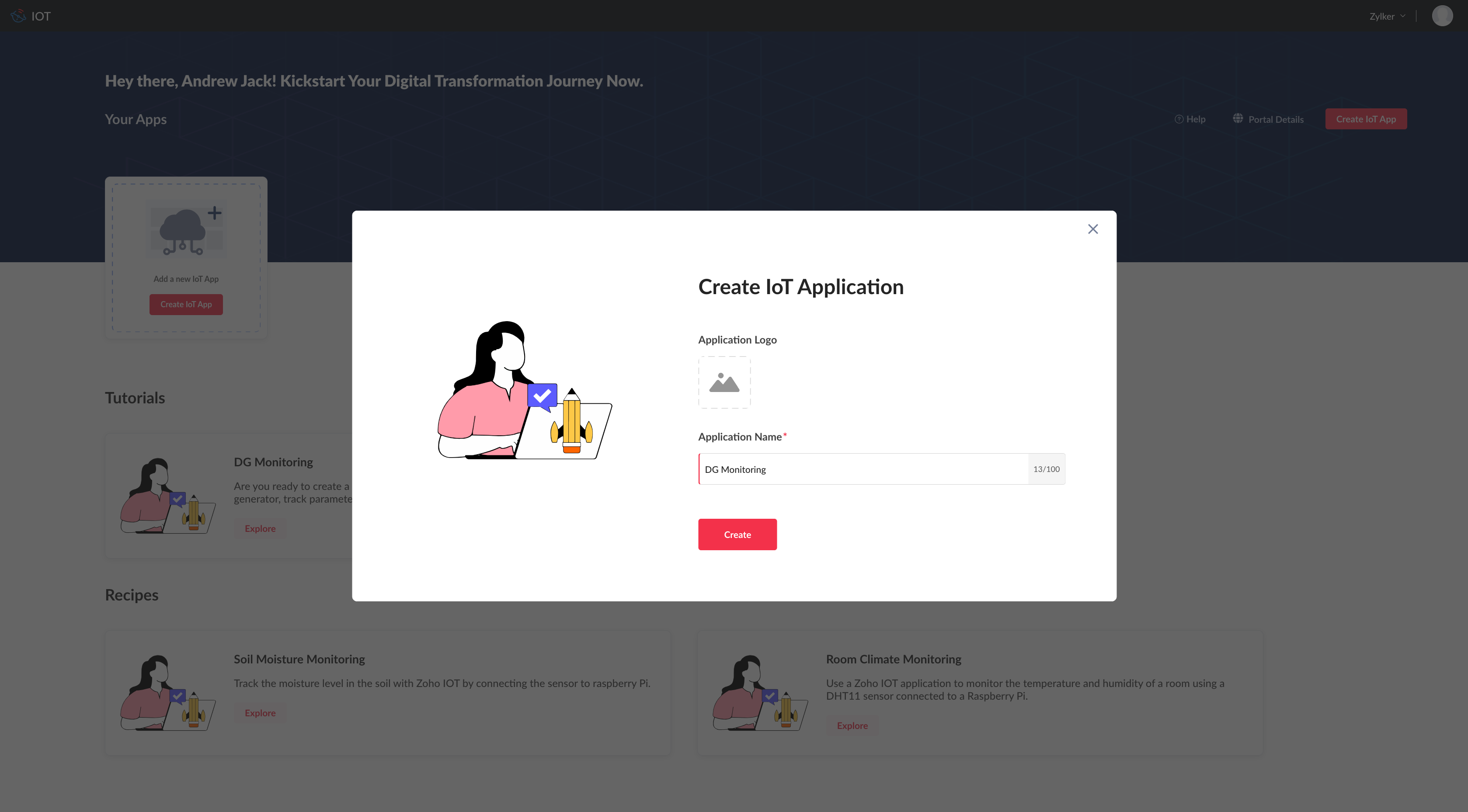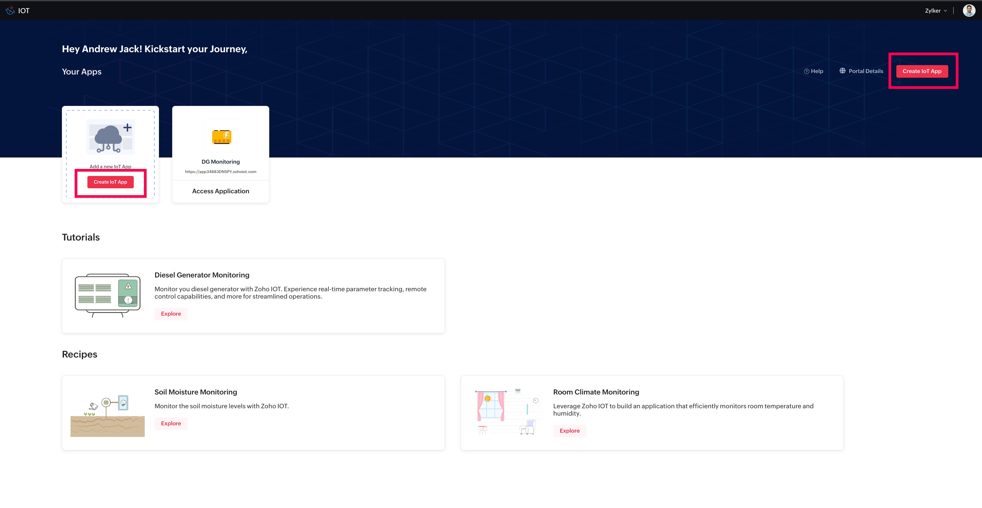 1. Go to the Zoho IOT Application's Home page.2. If you are not signed in, click the Sign In button and continue.Else, if you are signed in, the portal page will be displayed.3. Click Create Application.