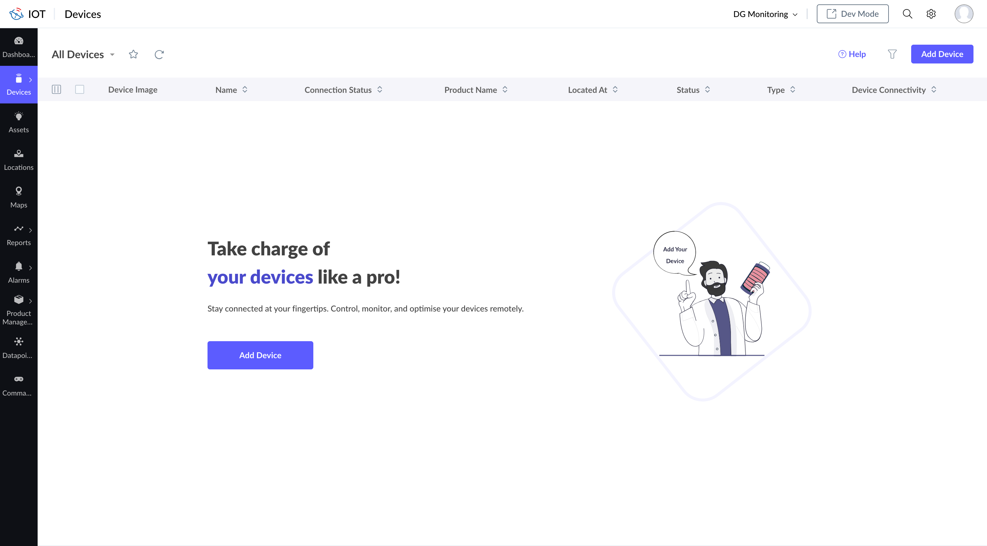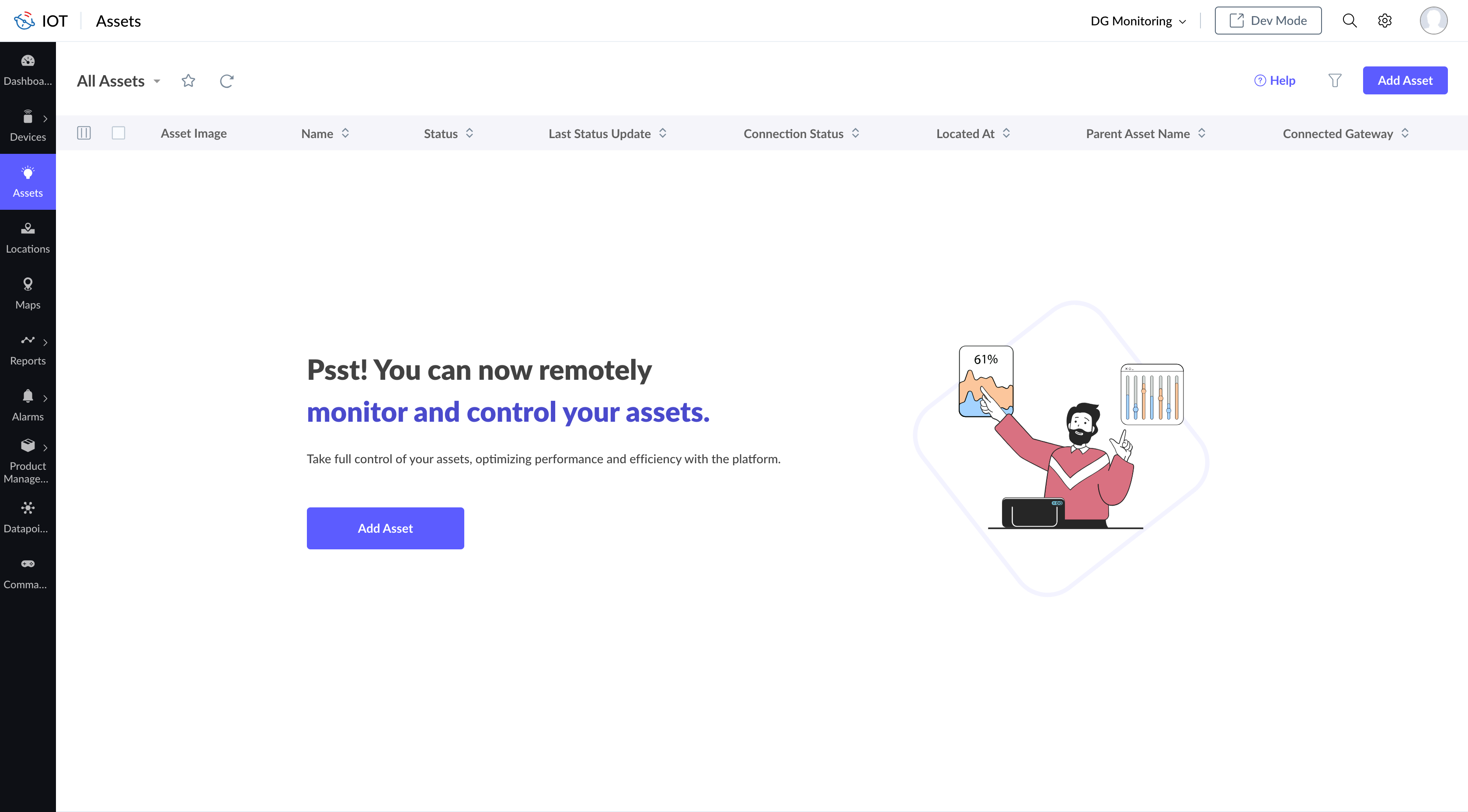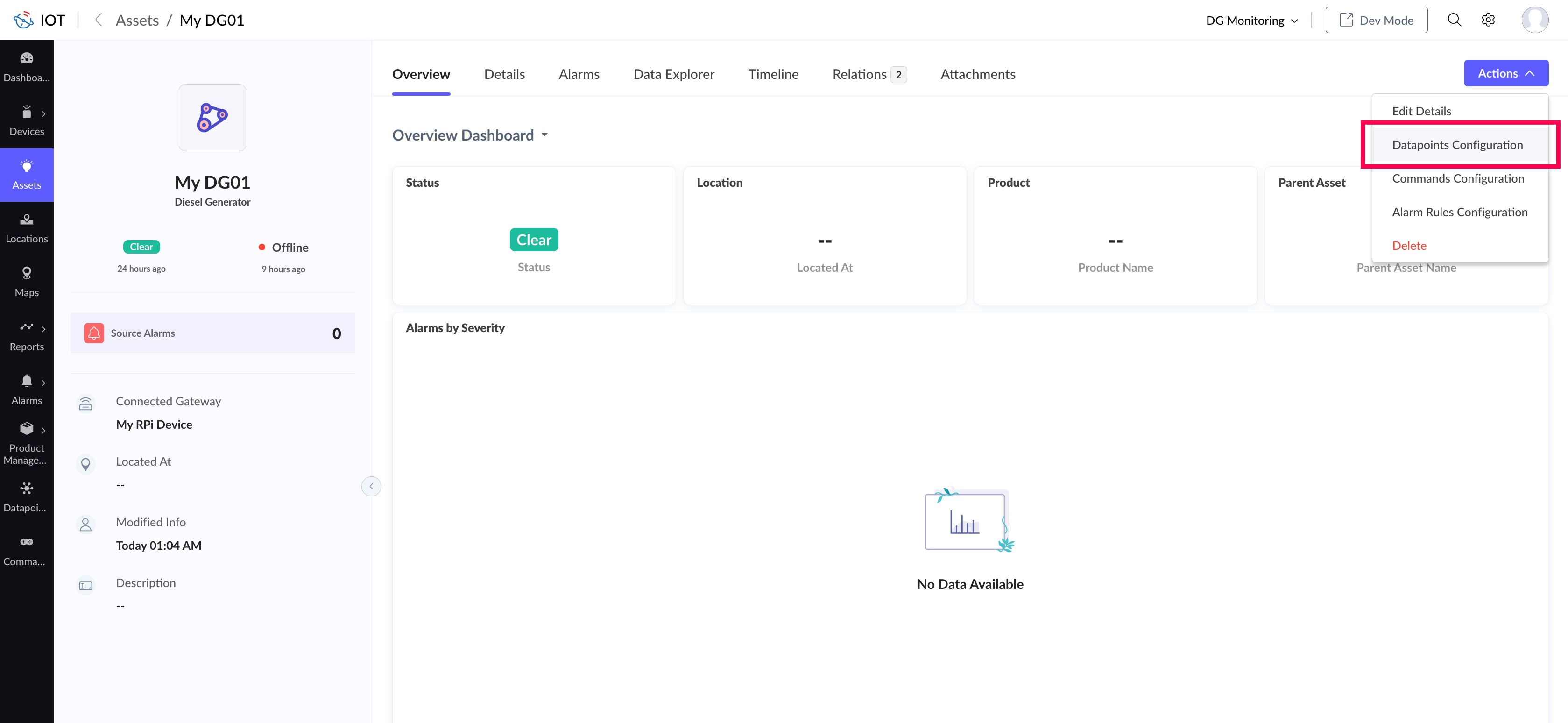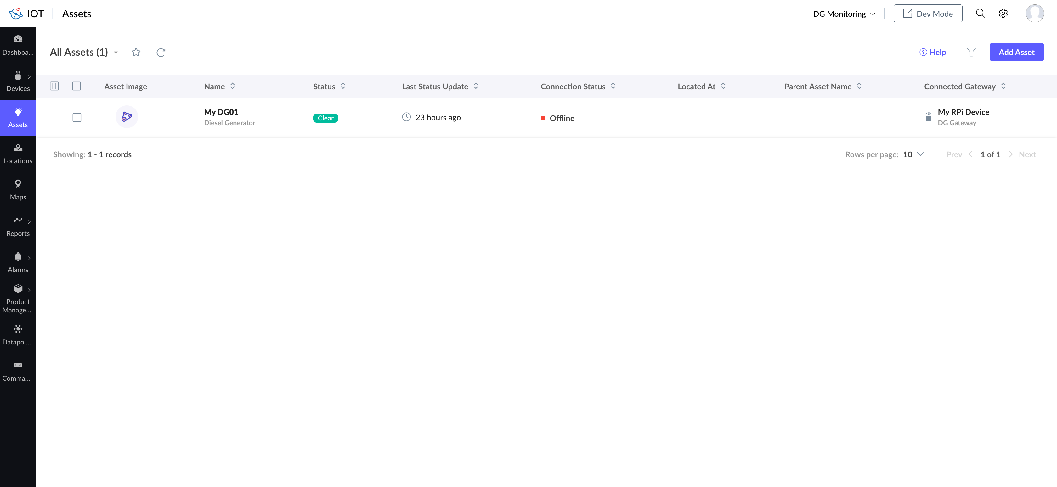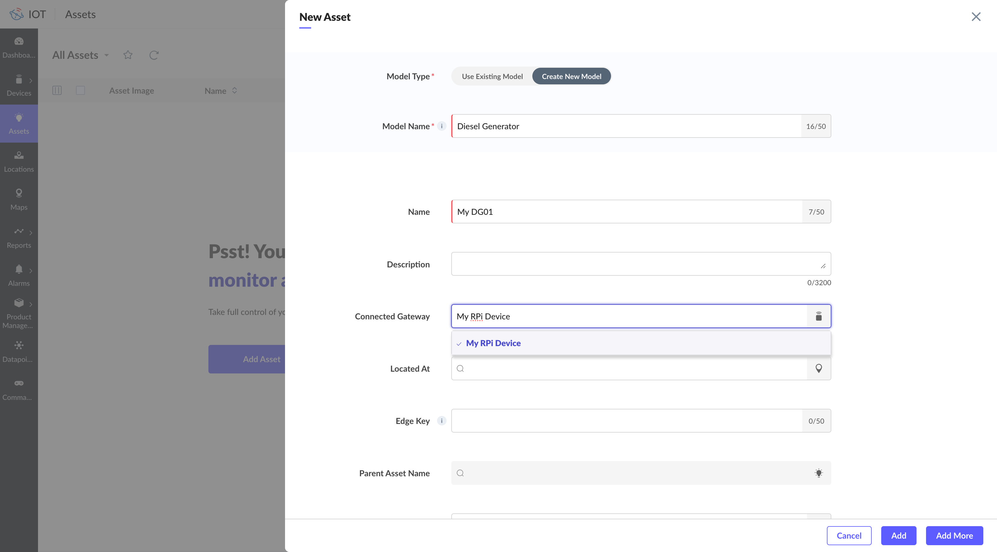 Model Name Diesel Generator Name My DG01 Connected Gateway My RPi DeviceNote: Name provided is for illustration purpose only; users are free to provide any name of their choice.The Connected Gateway (device) selected is the device created in the previous step; please select the name you have provided while adding the device.5. Click Add, and a new asset will now be added to the application. You will be redirected to the Asset's information page.