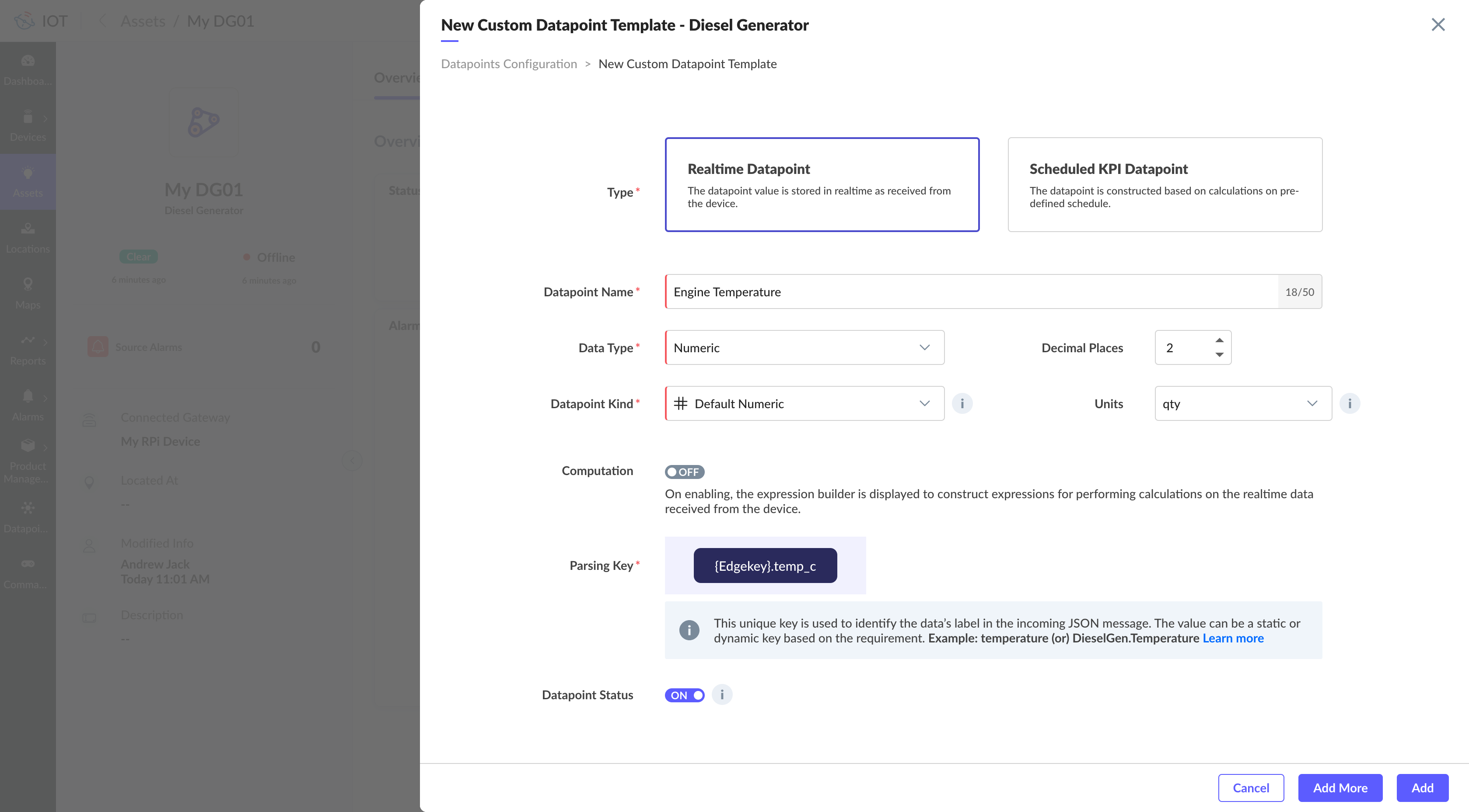 Datapoint Name Engine Temperature Data Type Numeric Decimal Places 2 Datapoint Kind Motor Temperature Units Celsius Computation OFF Parsing Key temp_c PII Data OFF Datapoint Status ONNote: The Parsing key may differ and is based on the payload sent by the application. Provide the key corresponding to the monitored temperature as sent in the payload.8. Click Add.9. Click Add in the Datapoint Addition Alert pop up. A new datapoint will now be added to the asset.Repeat the same steps given above with the listed information to create two more datapoint templates Engine Temperature and Fuel Level.Datapoint: Engine RPM