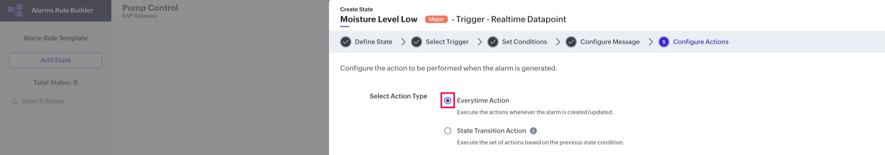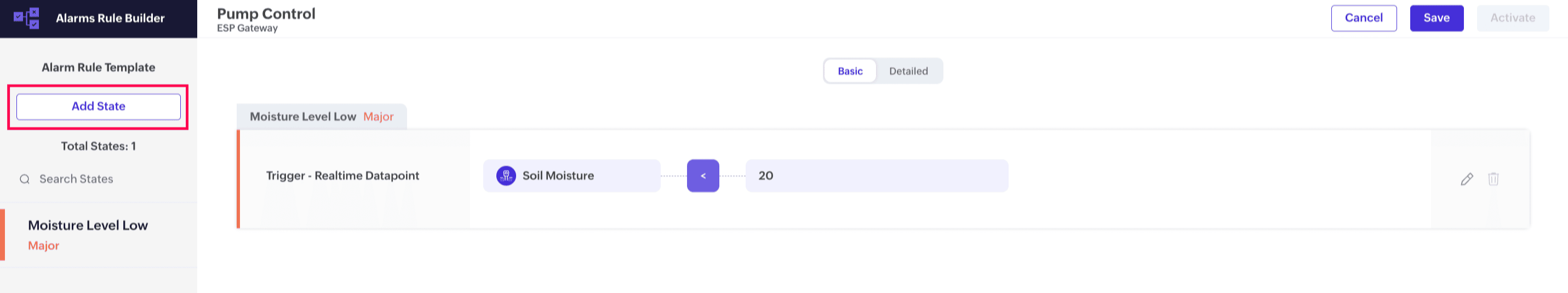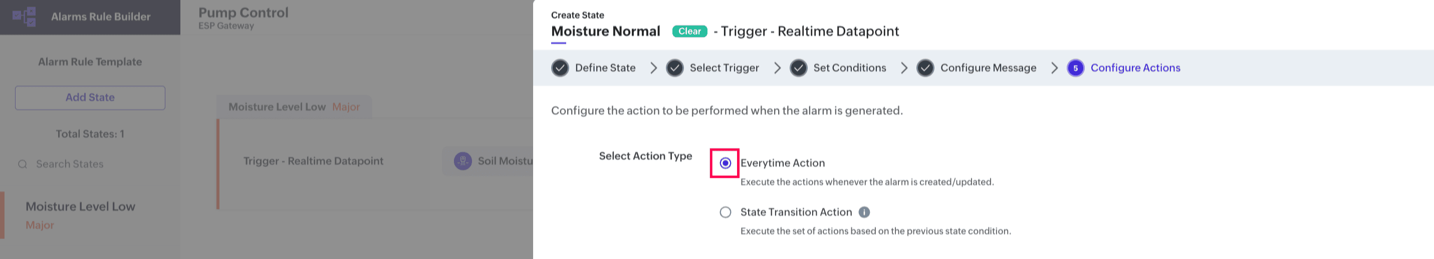 You can now set up an alarm rule to automate the pump's ON/OFF functionality. Configure the rule so that if the soil moisture level drops below 20, the pump will automatically turn ON. Conversely, if the soil moisture level rises above 80, the pump will turn OFF. This ensures optimal watering based on real-time soil conditions.