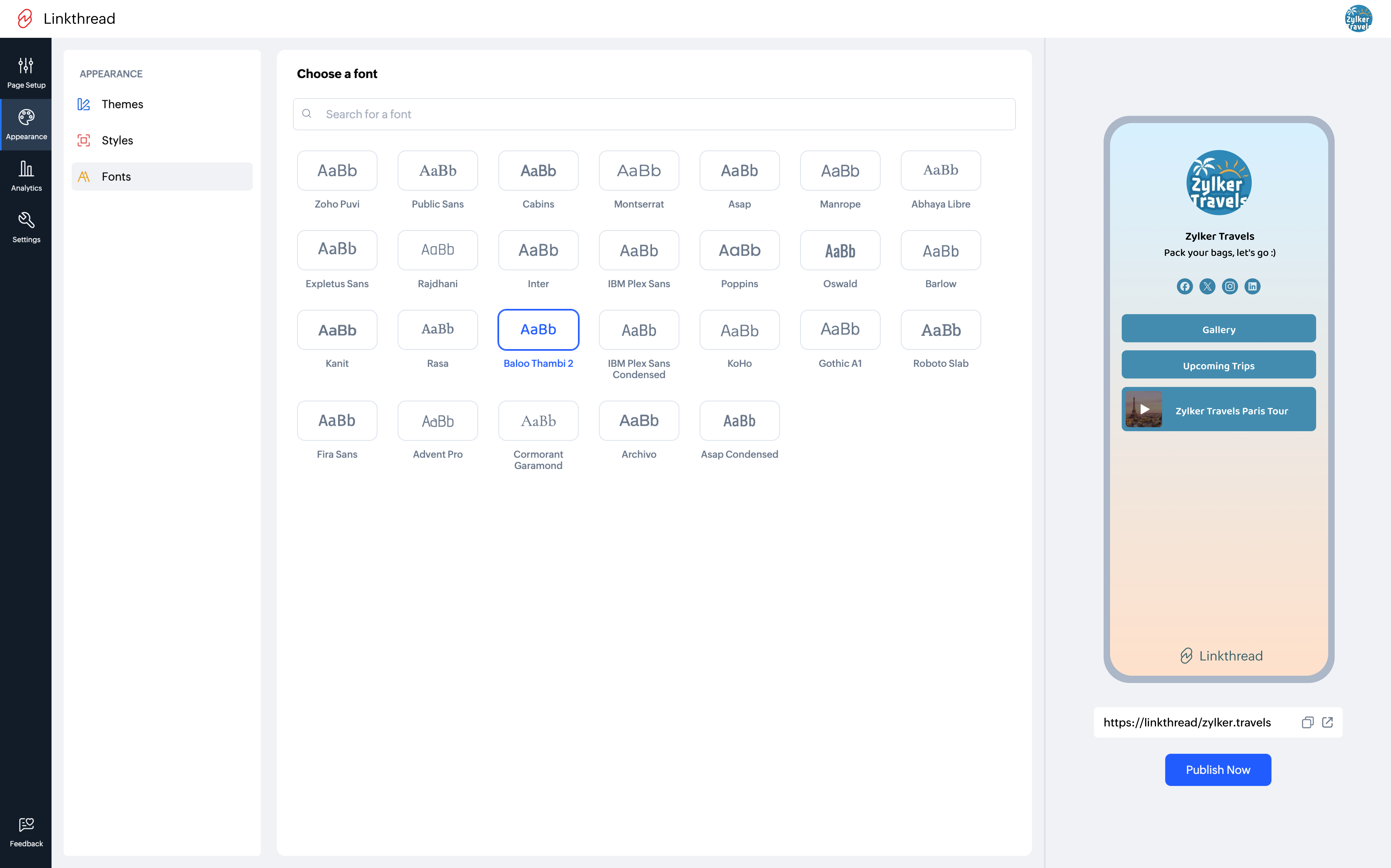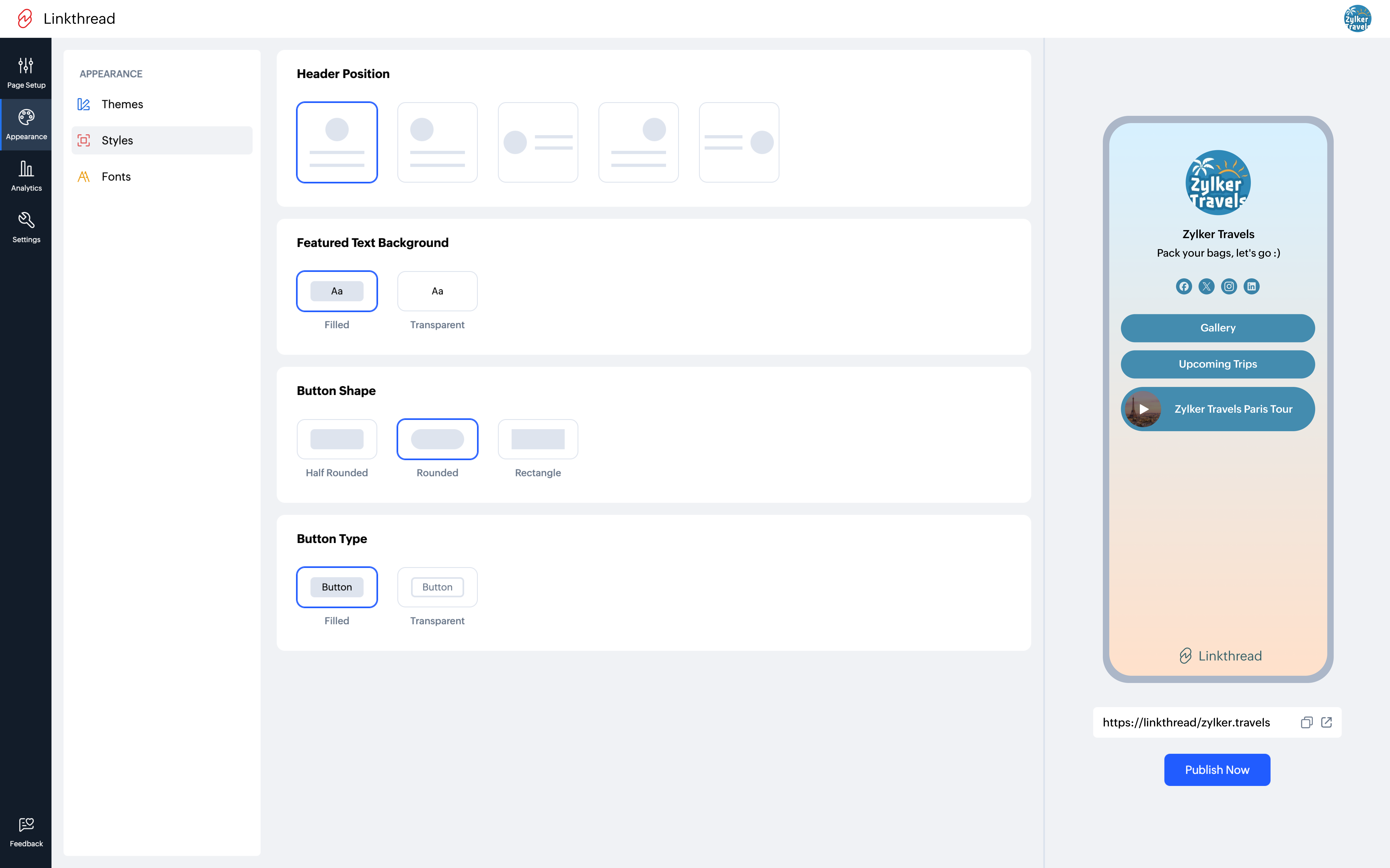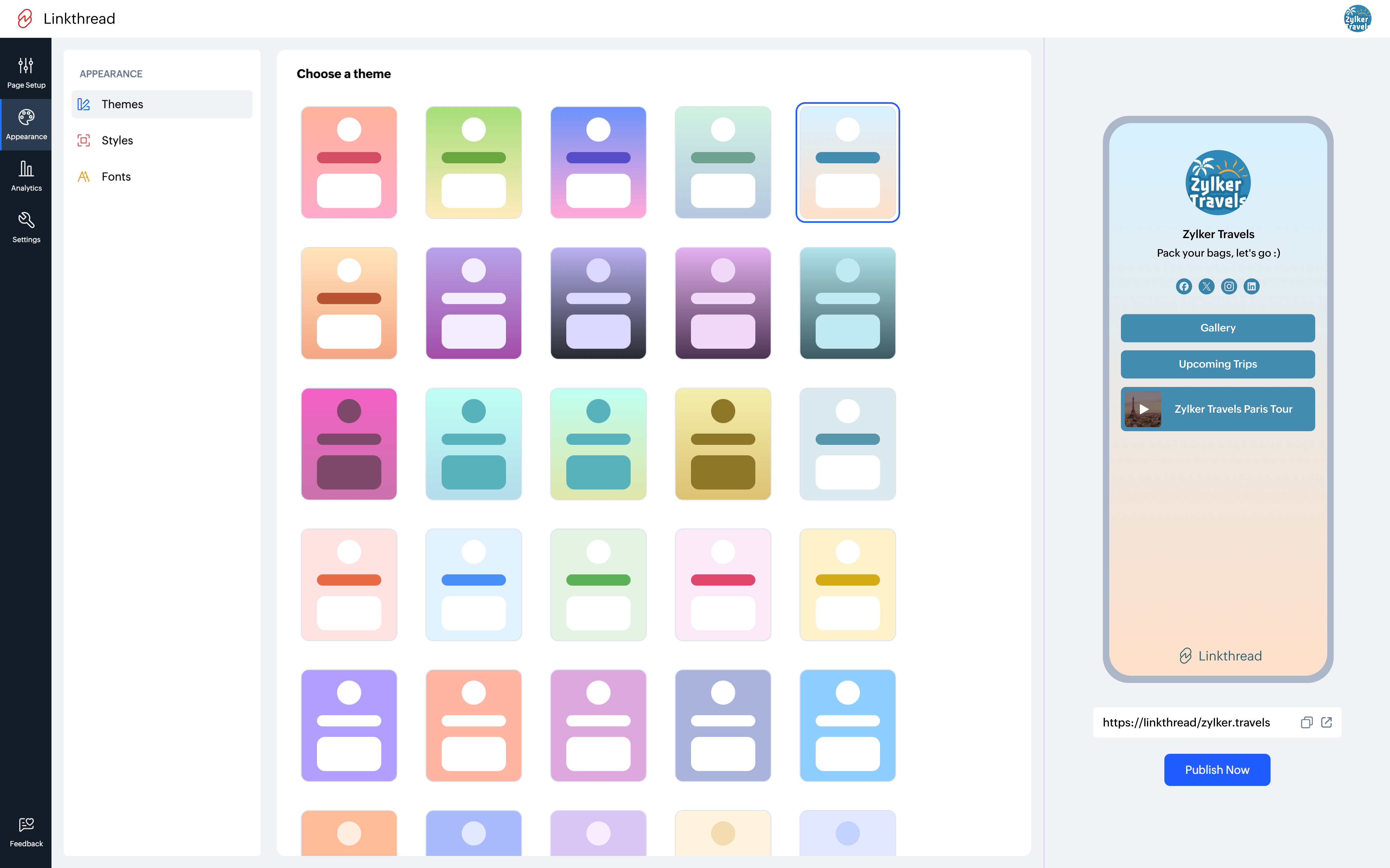 Themes: Linkthread currently has 50+ themes that you can choose from to make your page look attractive and cohesive with your brand.