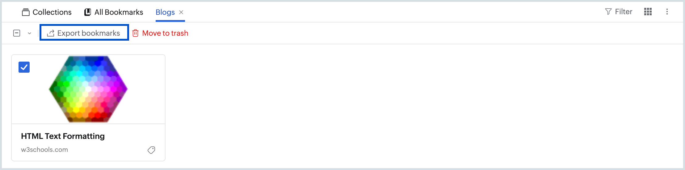 You can also export specific bookmarks by selecting and exporting them. To export the bookmarks, navigate to the group or collection and select the bookmarks. Click on the Export links button on top. Your export will be scheduled and an email with the link to download the exported links will be sent to your mailbox. You can download and view the bookmarks in any other device or share them.