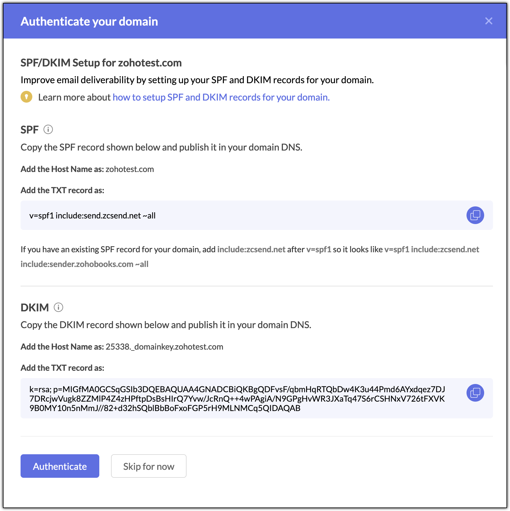 At Zoho Marketing Automation, we strongly urge you to authenticate your domain by implementing SPF and DKIM.