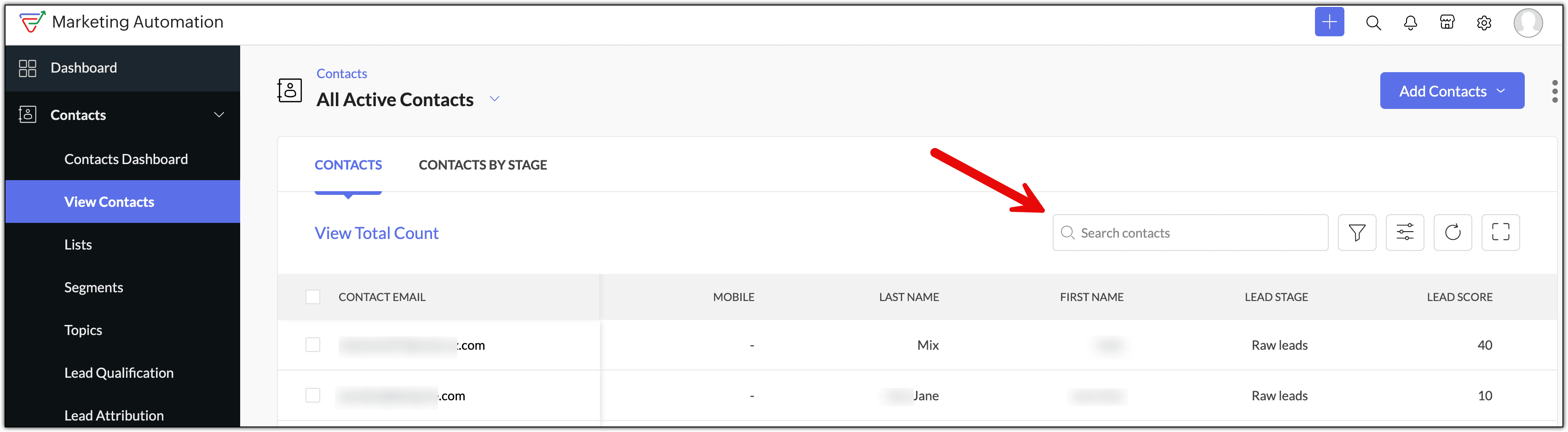 • The search option is also available in the Contacts tab present inside a Segment, List, and Tags module.