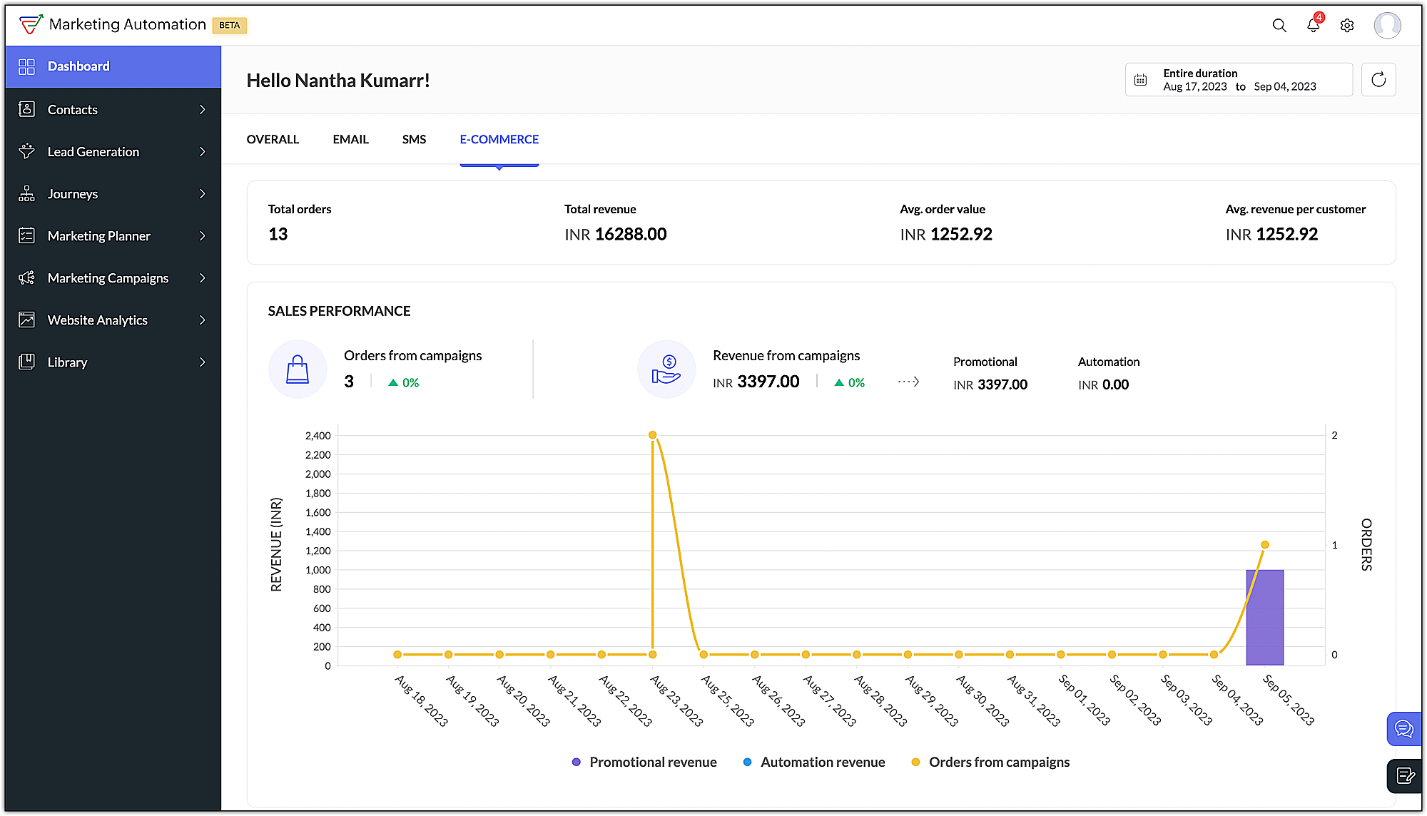 2. Sales performance  : This section gives you a general idea about your ecommerce store's sale performance displaying the number of orders generated through campaigns, the total revenue generated along with breakthrough of how much revenue was generated through promotional campaigns or automation emails.