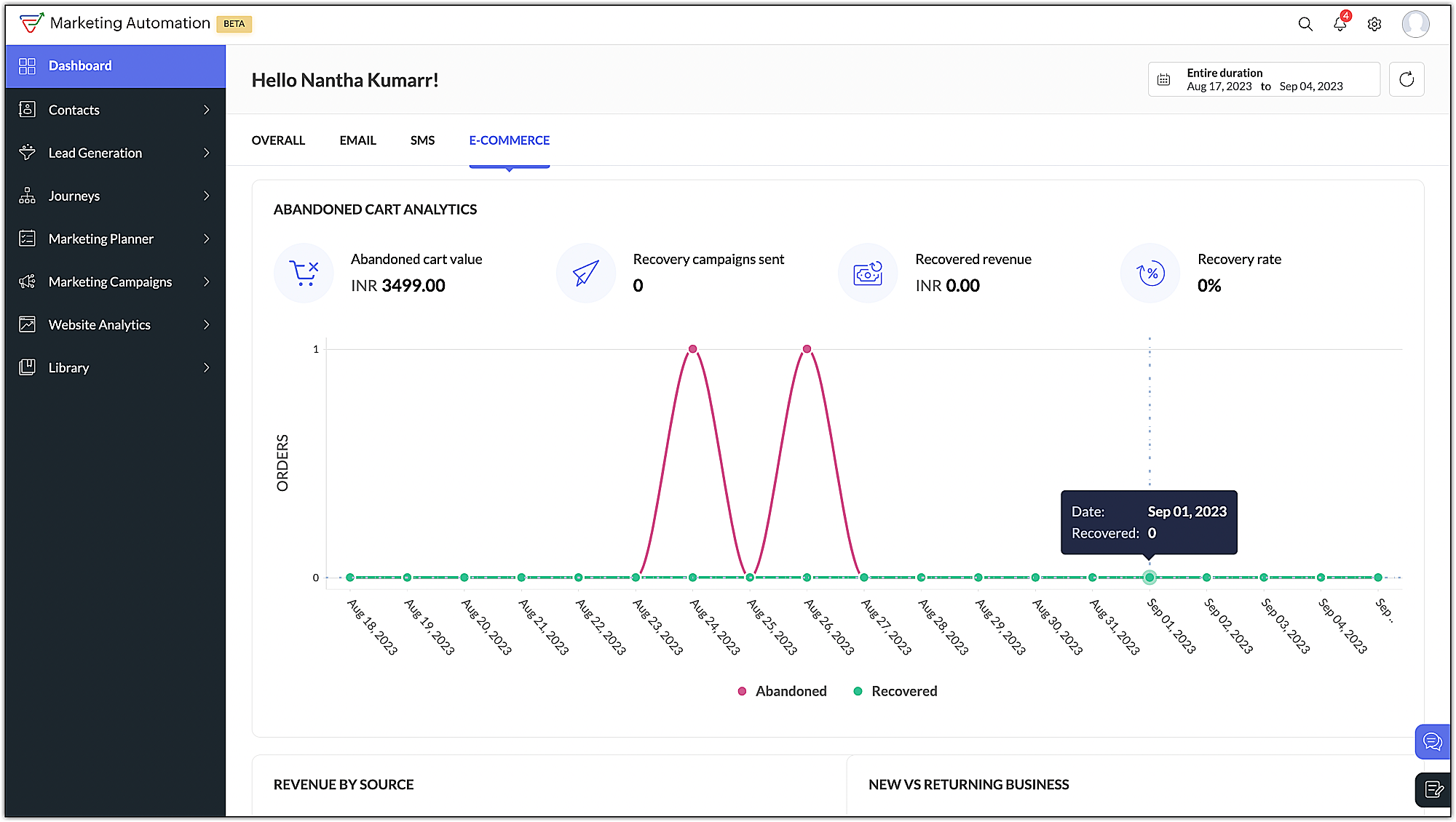 Note : Please note that the ecommerce dashboard will only be visible in accounts of those whose ecommerce store ( Shopify or Zoho Commerce) has been integrated with Zoho Marketing Automation.