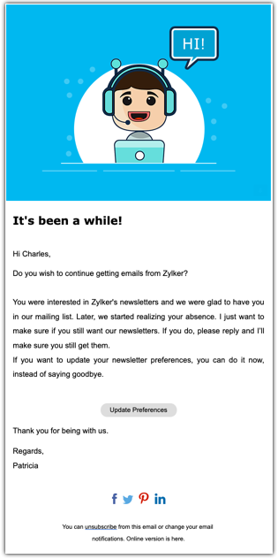 People subscribe to a newsletter when they have a curiosity to try something new. Later, they may lose interest gradually and may not be as responsive as they were. By regularly engaging with them, you can keep them interested in your emails. If they're still unresponsive, the best solution is to send them winback campaigns and know if they want to exist in your mailing list.