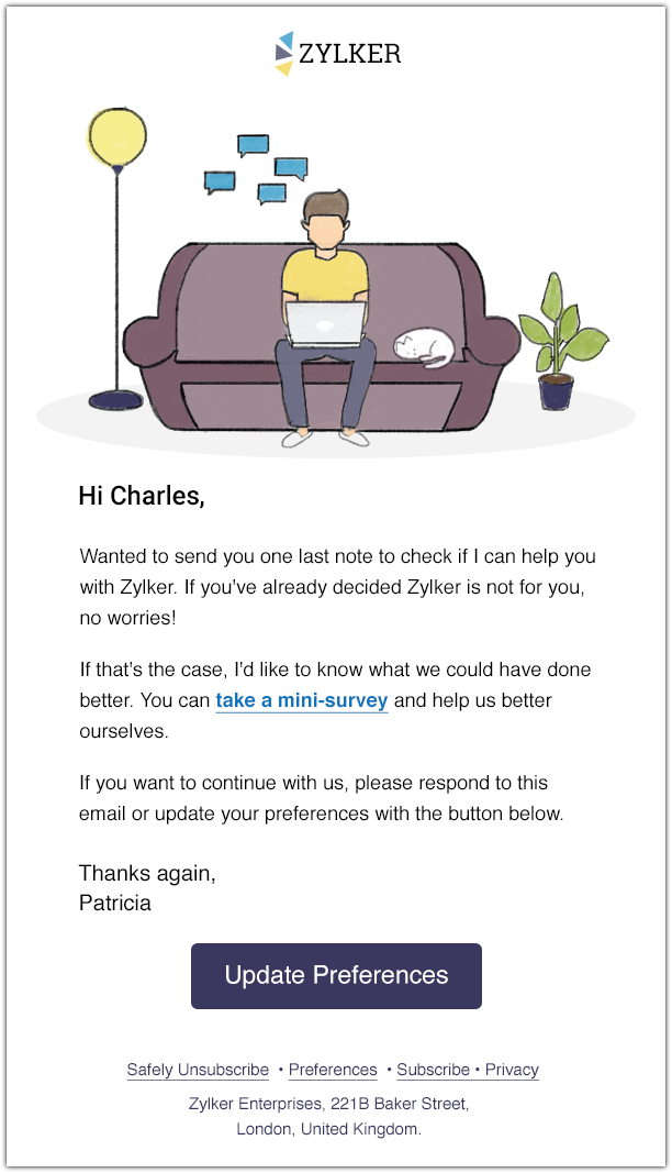 - You can include update profile as a CTA or in your email footer and give an option to choose their preferences instead of opting out.