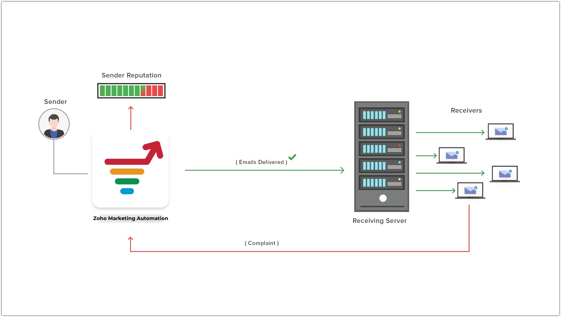 Complaints are either manually generated or triggered by when a recipient marks an email as junk/spam. These complaints are sent to Email Service Providers(ESPs) and Internet Service Providers(ISPs) who then alert the sender about these complaints. If the recipient submitted a complaint manually, the ESP/ISP will send the recipient's details as well as the complaint information. When the recipient marks an email as spam, further emails to that recipient may be classified as spam, quarantined, or rejected. Additionally, the ESP will add a negative score to your sender domain. These negative scores tend to have a negative impact on your domain's reputation and may lead to blacklisting. Zoho's system will automatically move the email addresses associated with such complaints to the Do-Not-Mail registry.
