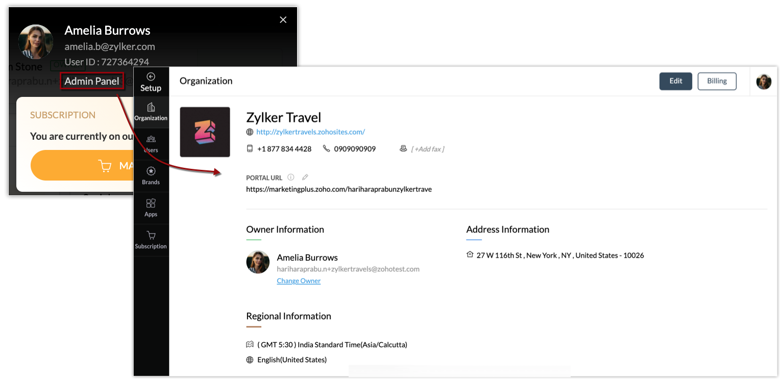The admin panel can be accessed by clicking the Profile Icon > Admin Panel. You can also access the admin panel by clicking the setup icon. Here is where you can manage users, brands, and settings of all the applications.