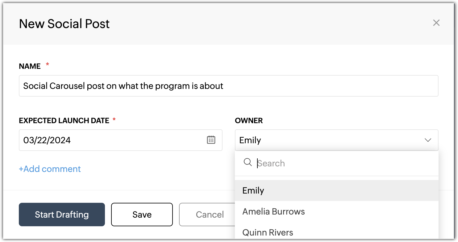3. Enter the Name, Expected Launch Date, and select the Owner from the drop down list.