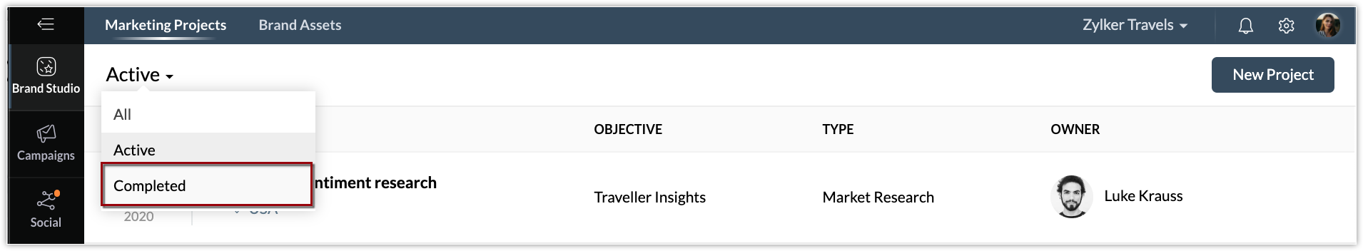Projects can be filtered from the list view in Brand Studio. You can select Completed from the drop down list at the top left corner to view projects that are completed.