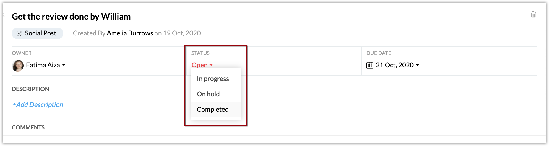 Select a task and choose the status from the Status drop down list.
