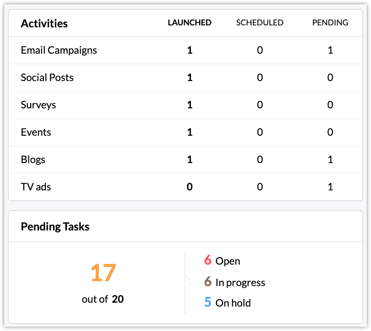 Yes, the Overview page of the Marketing Project displays all the activities along with their status such as Launched, Scheduled, and Pending. You can also get the status of all the tasks in a project.