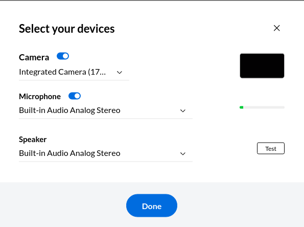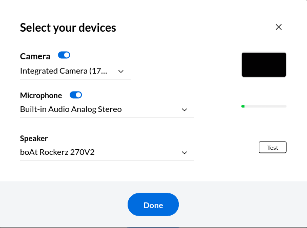 When choosing audio, try to use the same audio input and output devices. Using mismatched microphone and external speaker devices may cause an echo.