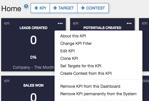You can add a new KPI from Dashboards. 1. Click DASHBOARDS on the top bar 2. Choose a dashboard which you want to add a KPI     * You cannot add a KPI to Pipeline Velocity or Pipeline Stages 3. Click on +KPI button on the top 4. Choose NEW KPI See ...