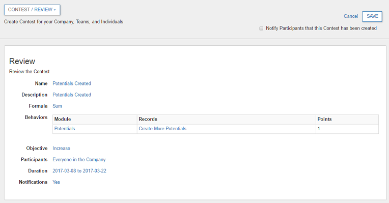 Behaviors define the CRM activities you'd like to track or motivate. For example, you can define a behavior to motivate your team to "create more lead records with telephone numbers", and award one point per record to the record owner.