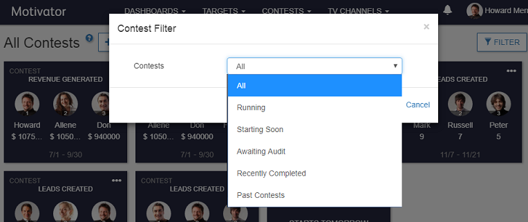 The status of contests in your organization are divided into the following categories in the Contest Filter.