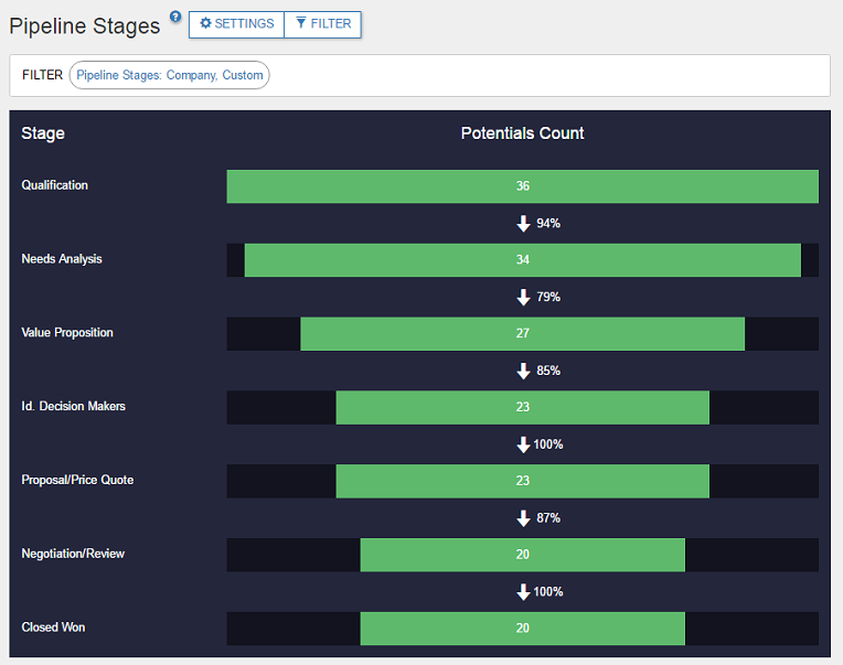 This dashboard shows your win rate, average sales cycle length, and stage conversion rates for potentials closed in the selected period. This provides additional visibility into how potentials are moving through your pipeline toward becoming Closed Won deals.