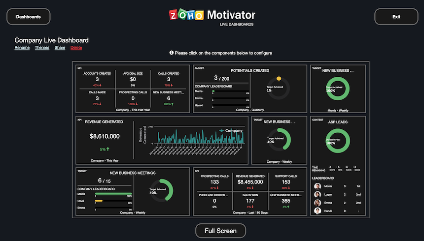 Live Dashboards in Zoho Motivator provide a real-time view of your dashboards to help you track and improve your sales performance. Live Dashboards provide a unified view of selected tiles (such as KPI, targets, and contests) to highlight areas of interest.