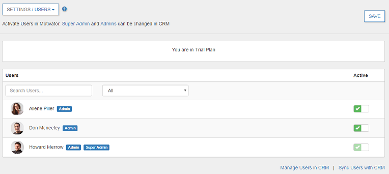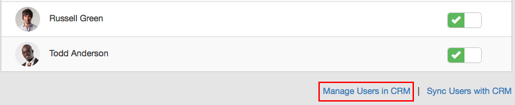 - Click Manage Users in CRM in the bottom-right of the screen to open CRM’s Users screen. From here, you can add/remove users and change their permissions.