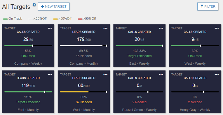 The Targets page shows targets set for the company, teams, and individuals. Administrators can view all targets, targets they're managing, their scorecard, and their personal targets. Non-administrators can view their scorecard and personal targets. Once administrators set targets, everyone receives personalized scorecards that indicate their progress visually to keep them engaged and on-track.
