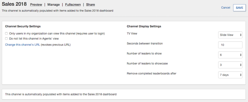 - Channel Display Settings: In TV View, select Slide View to show the information for each tile as slides, or select 4 x 4 Grid View to show tiles in a 4 x 4 grid, as in the dashboard. Specify the number of seconds between transition, number of leaders to show in the leaderboard, number of leaders to showcase with their performance chart, and when to remove completed leaderboards.