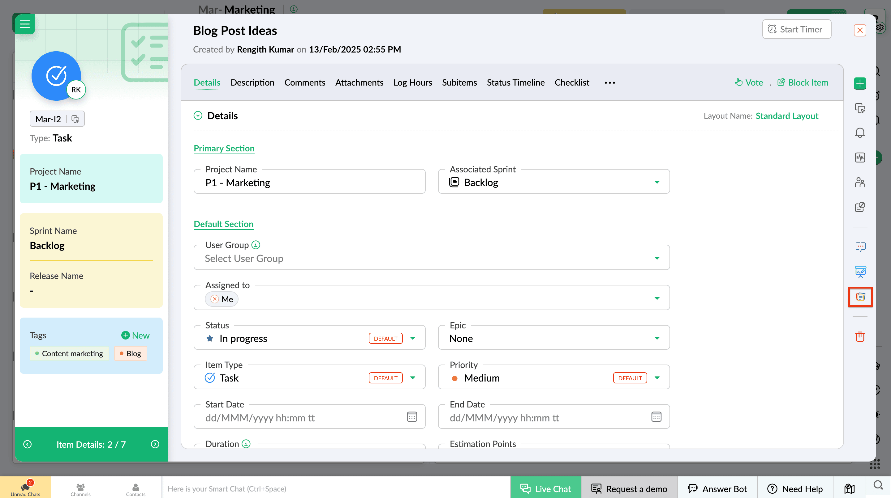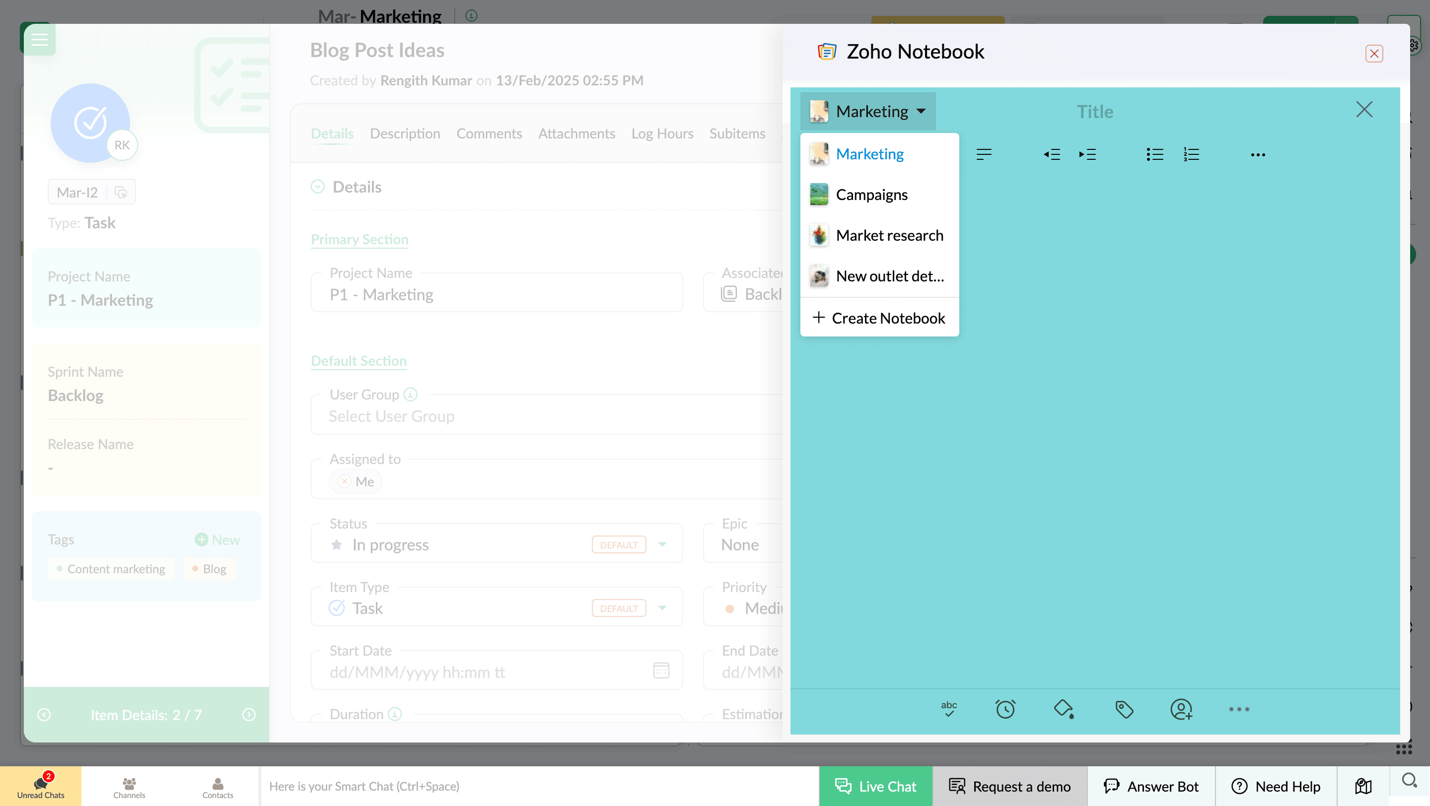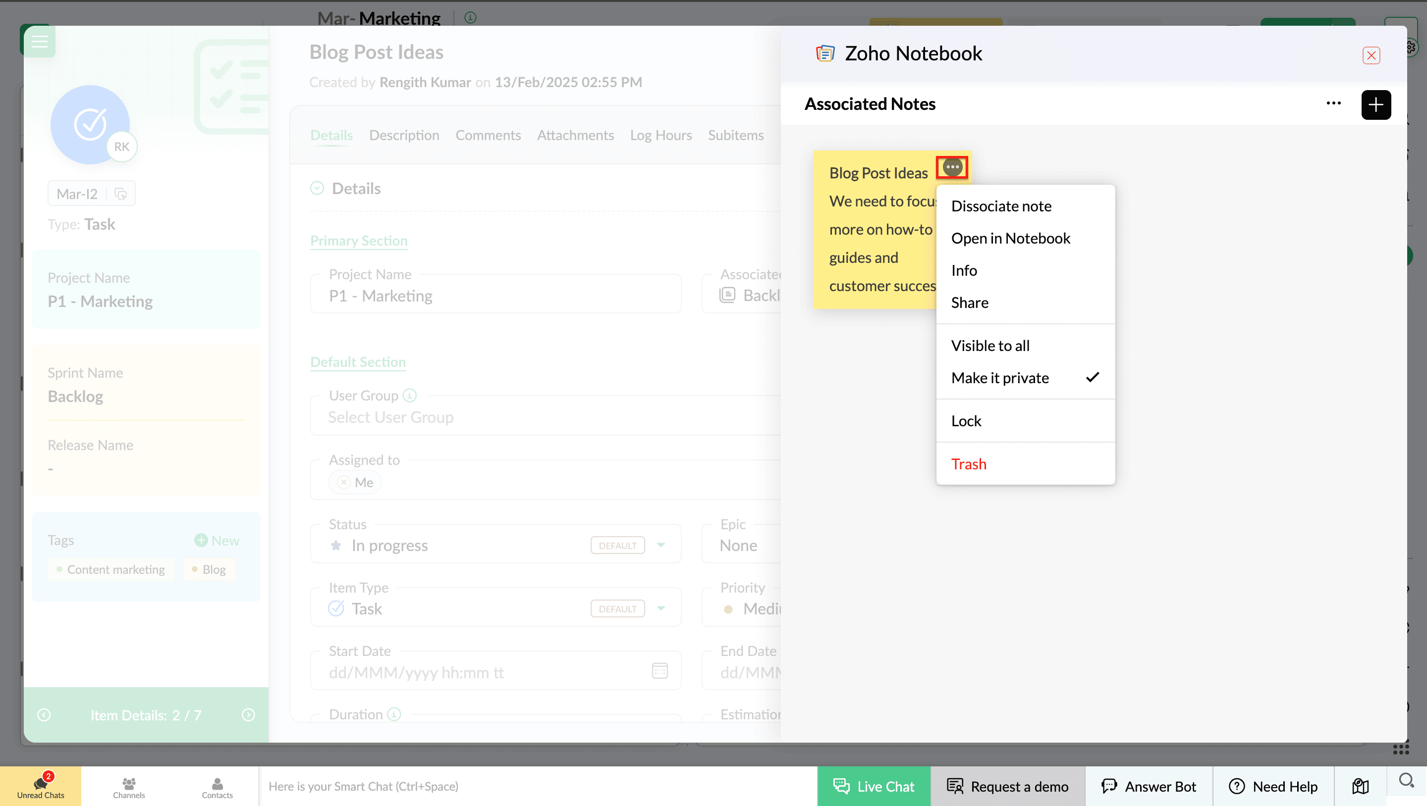 With this integration, you can associate notes with specific work items, ensuring quick access to essential details. Easily create work items from your notebook via Global View and control note visibility by making them private when needed. All notes sync seamlessly with Zoho Notebook, giving you uninterrupted access across devices for a smoother project management experience.