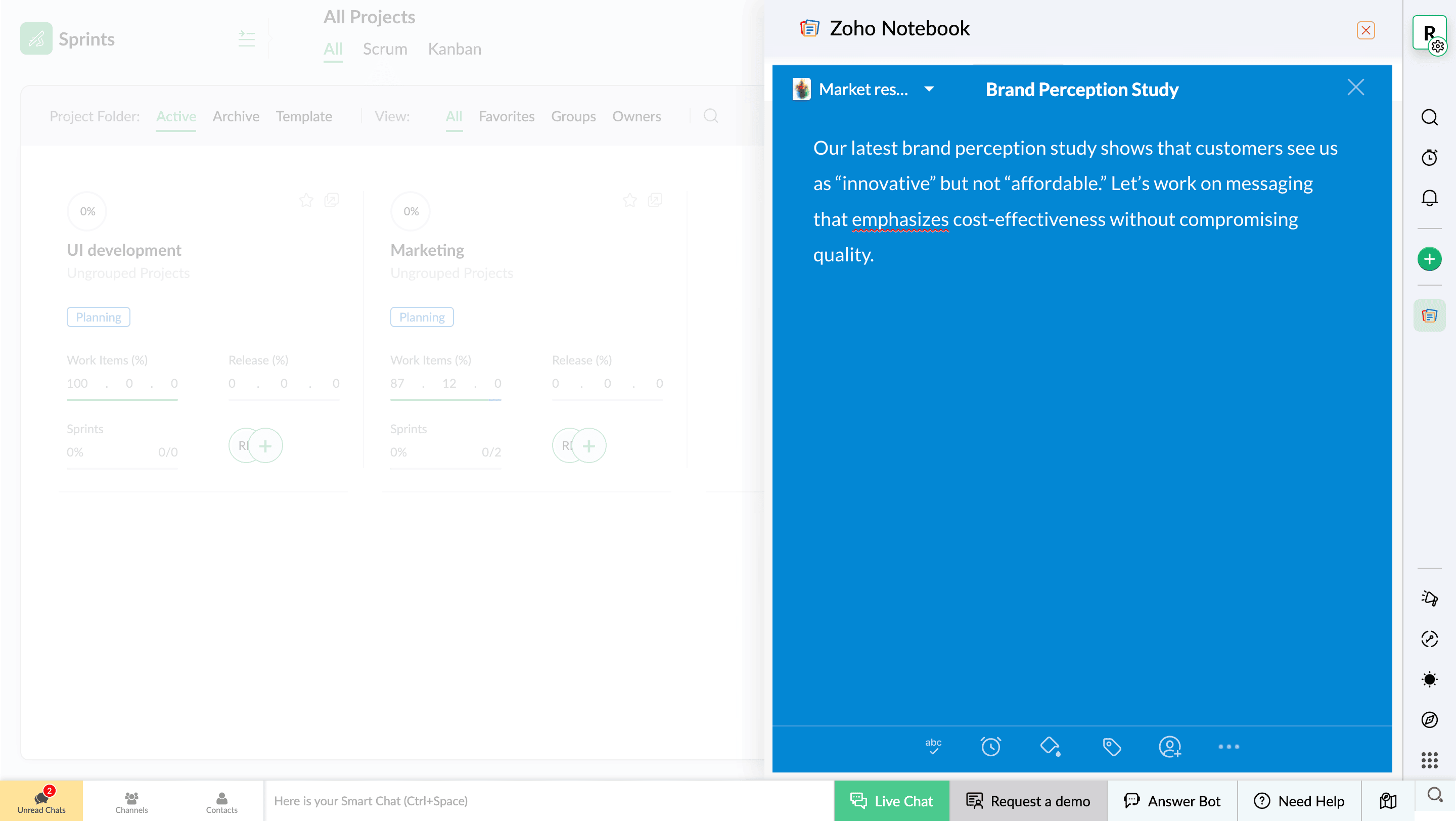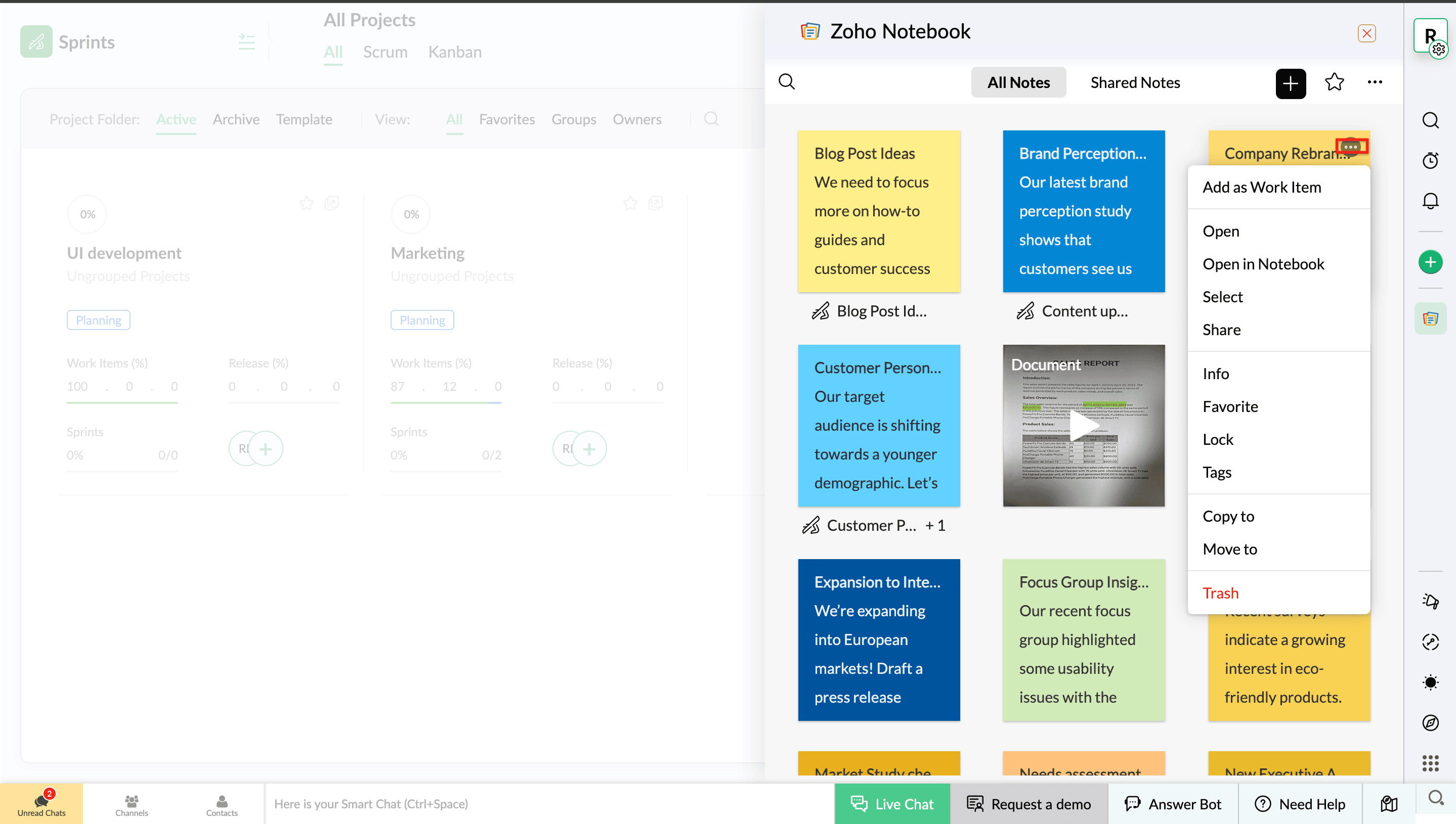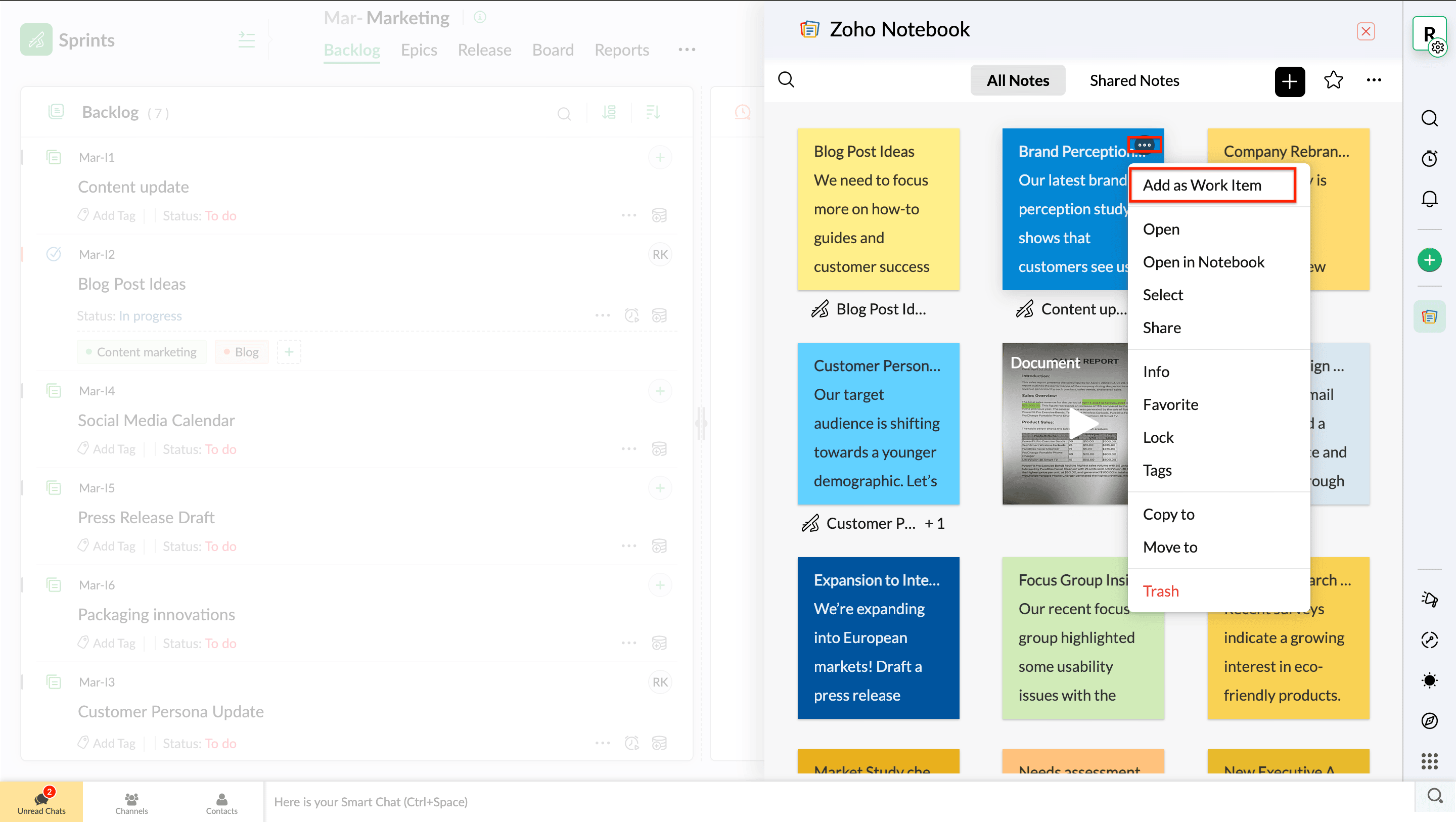 Enhance your agile workflow by combining Zoho Notebook's powerful note-taking capabilities with Zoho Sprints’ robust project management features. Capture important details, create checklists, and attach files directly within your Sprints workspace to keep project information organized.
