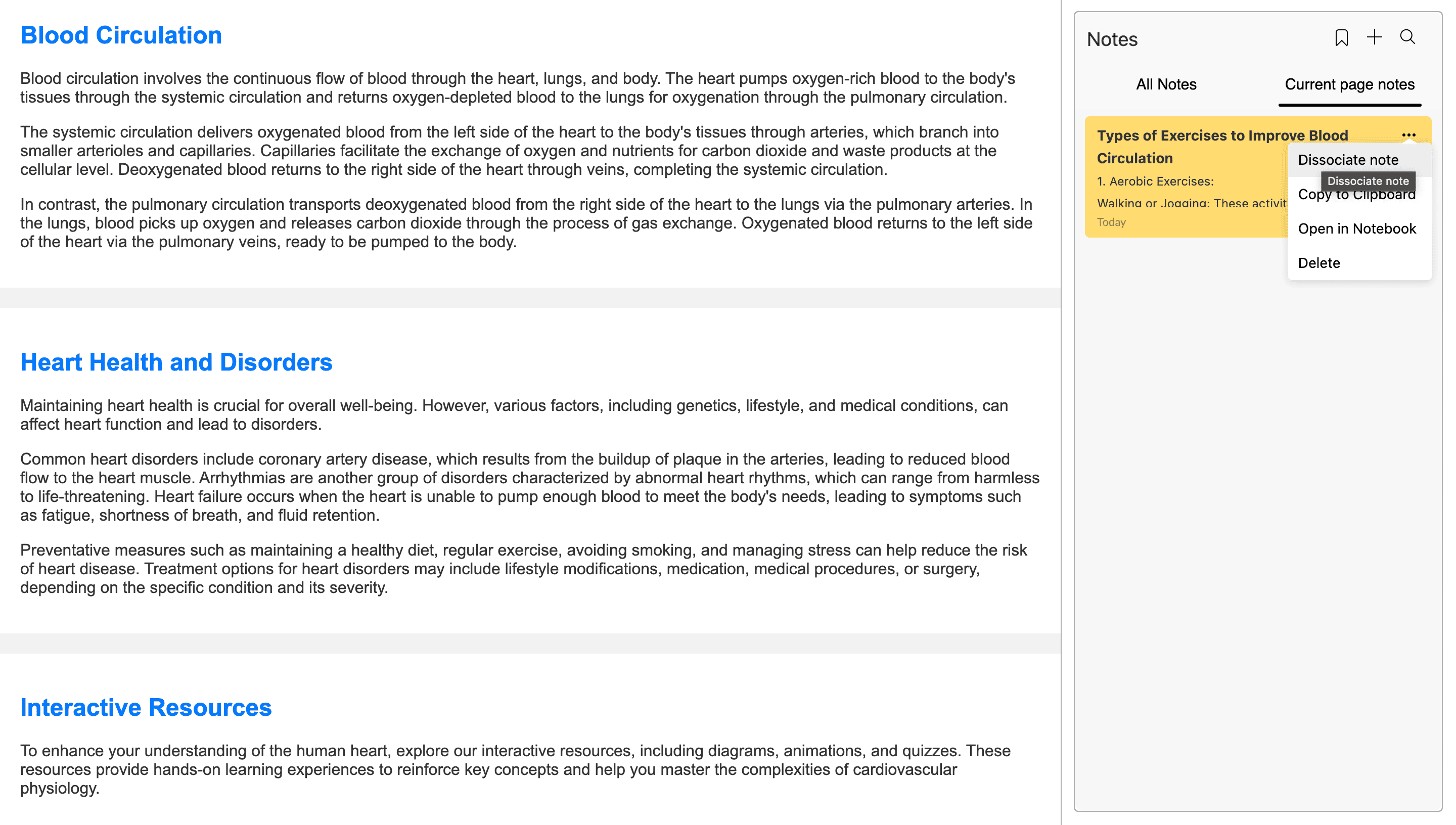- Click Dissociate note from the More Options icon of a notecard to dissociate it.