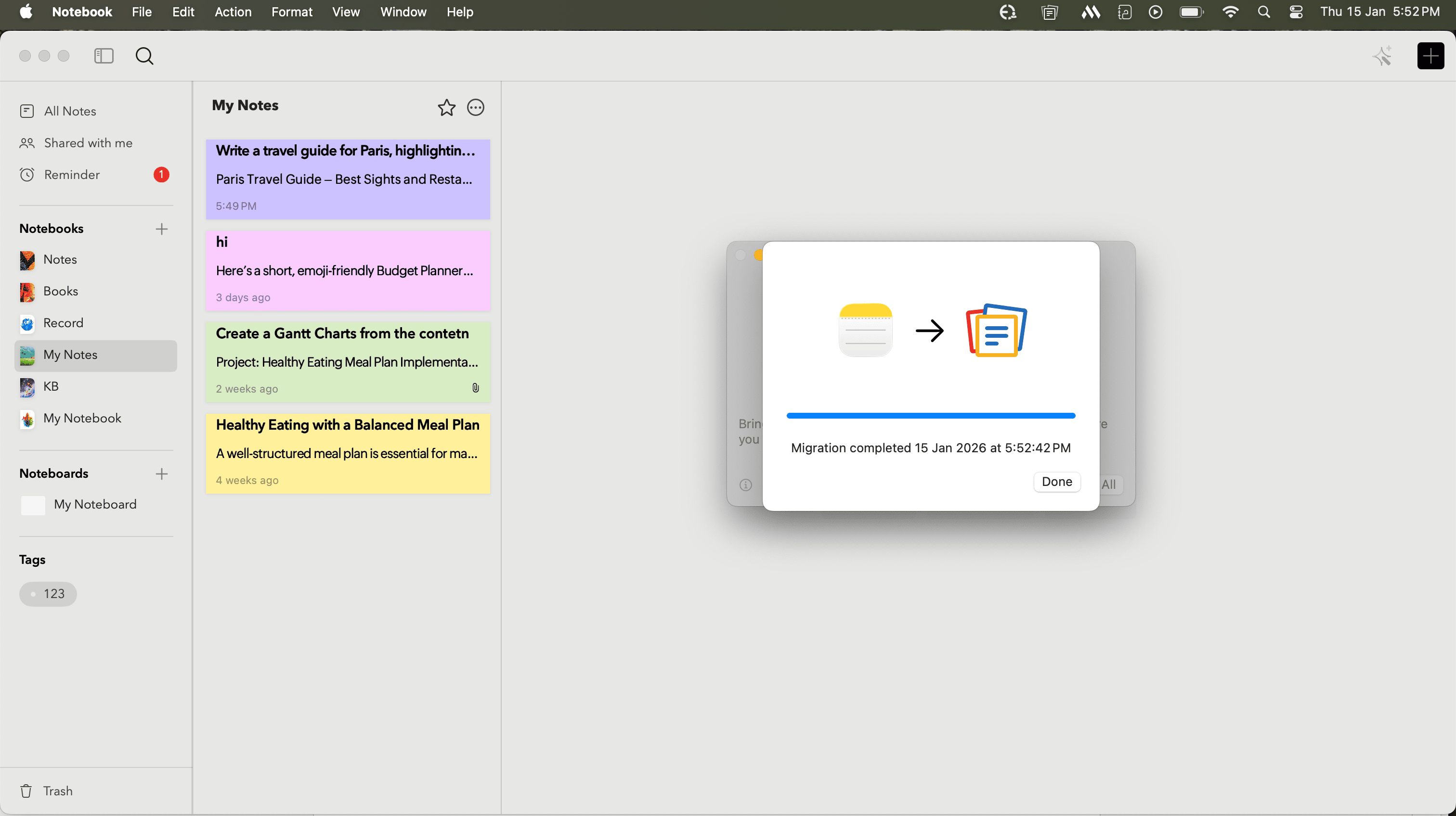 No. Migration is a one-time import process. Any changes made in Apple Notes after the migration will not be reflected in Zoho Notebook. To bring newly created or updated notes into Zoho Notebook, the migration will need to be initiated again.