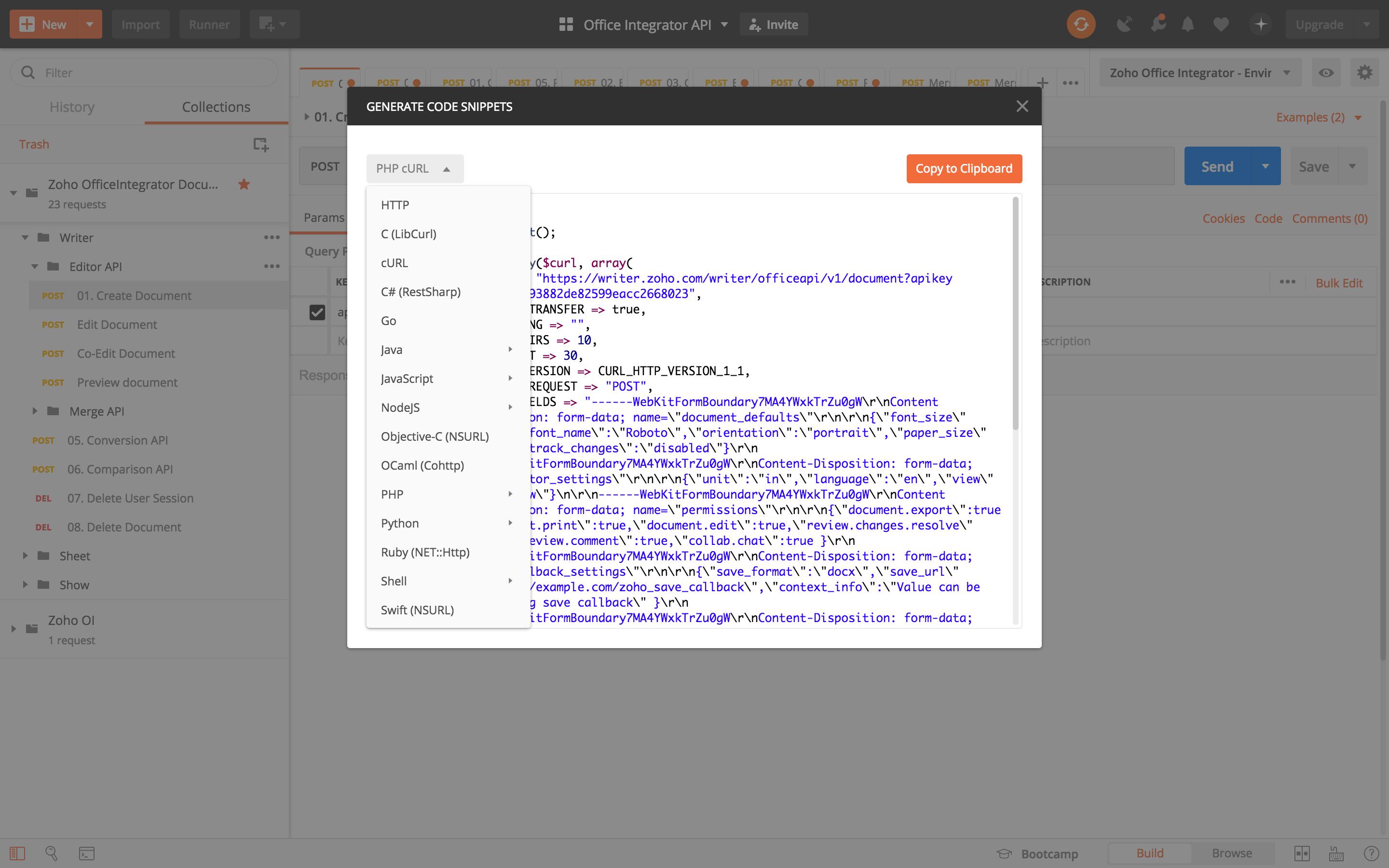Once the Postman Collection setup is completed, please follow the below steps to know how to get the Curl or PHP Curl codes.