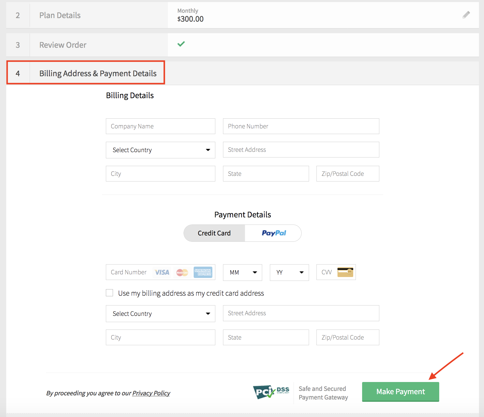 Step 5: Enter Billing Address, Payment Details and click "Make Payment".