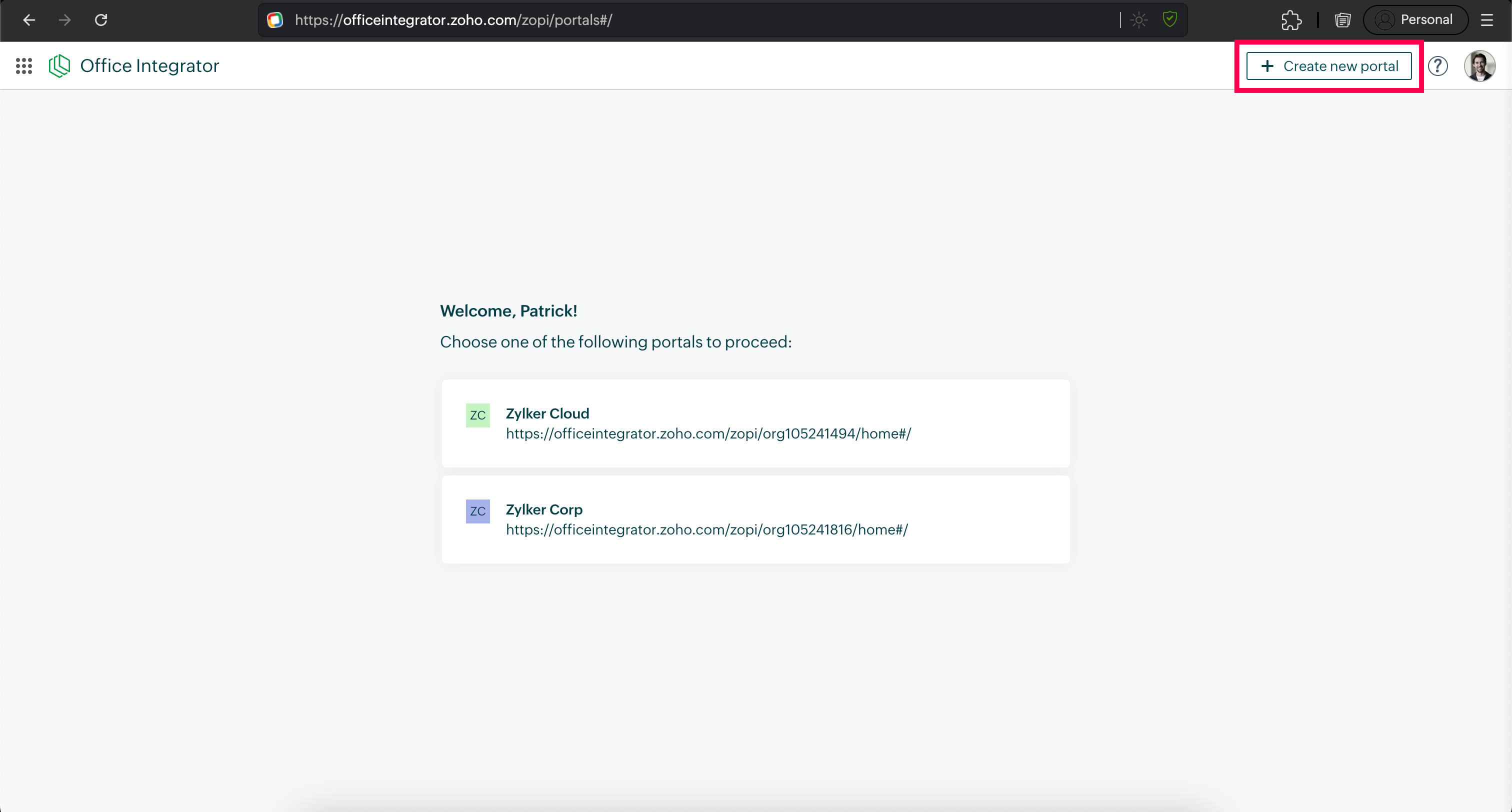 2. If you are in our portal listing page > Click on 'Create new portal' from top right-corner (as shown in below image)
