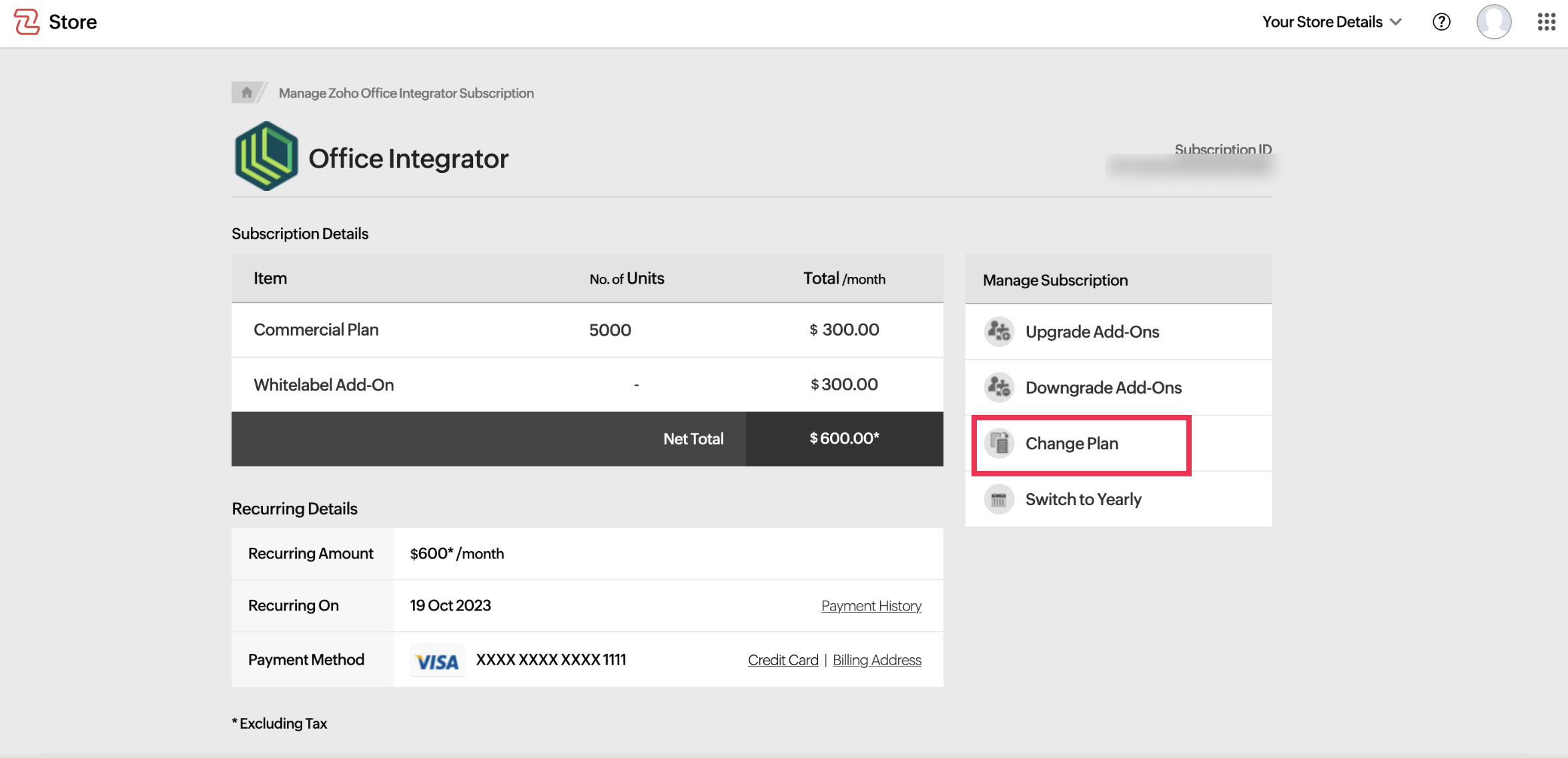 Go to Zoho Office Integrator Dashboard, click on Upgrade/Change Plan button. Then again, select Change Plan option under Manage subscription.