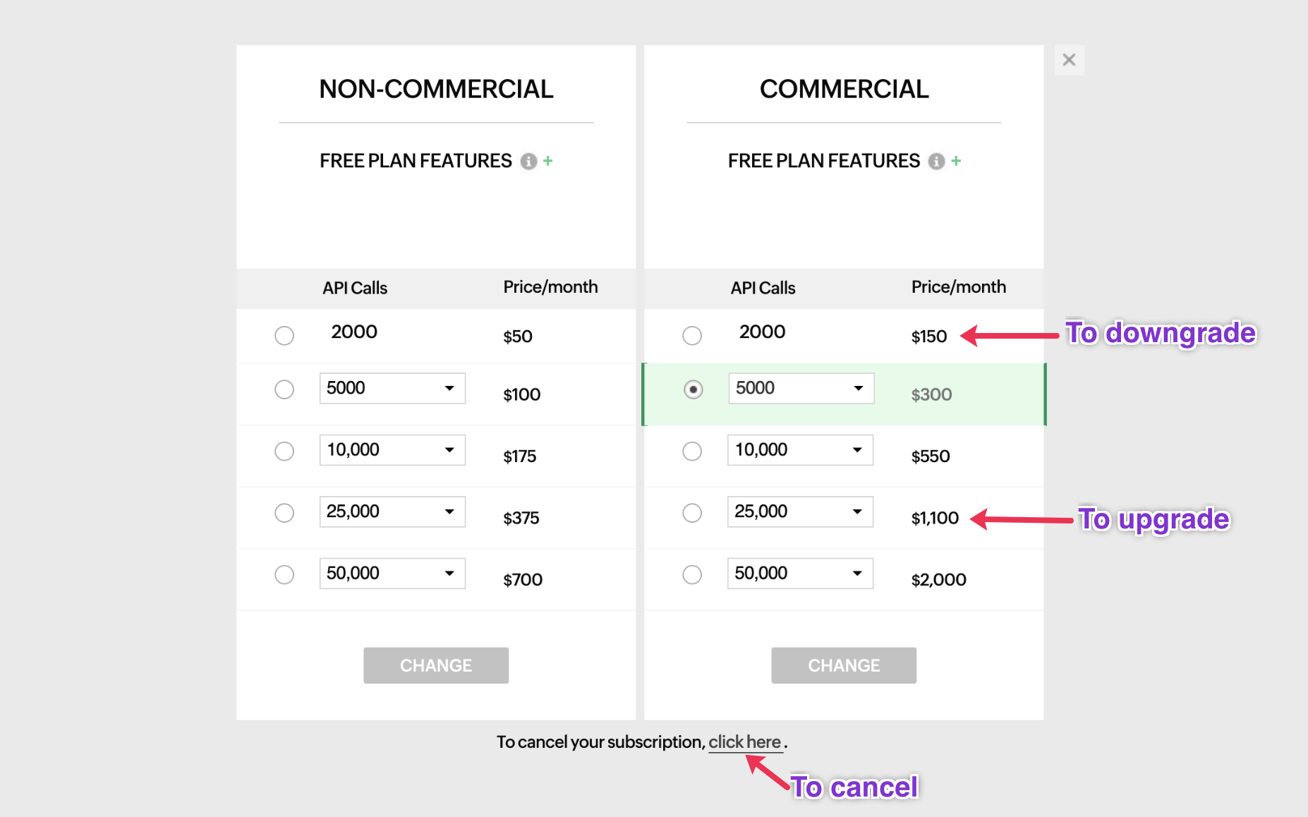 You can upgrade/downgrade the subscription, by choosing the required plan in the next page. To cancel the subscription, click on the cancellation link as shown in below image.