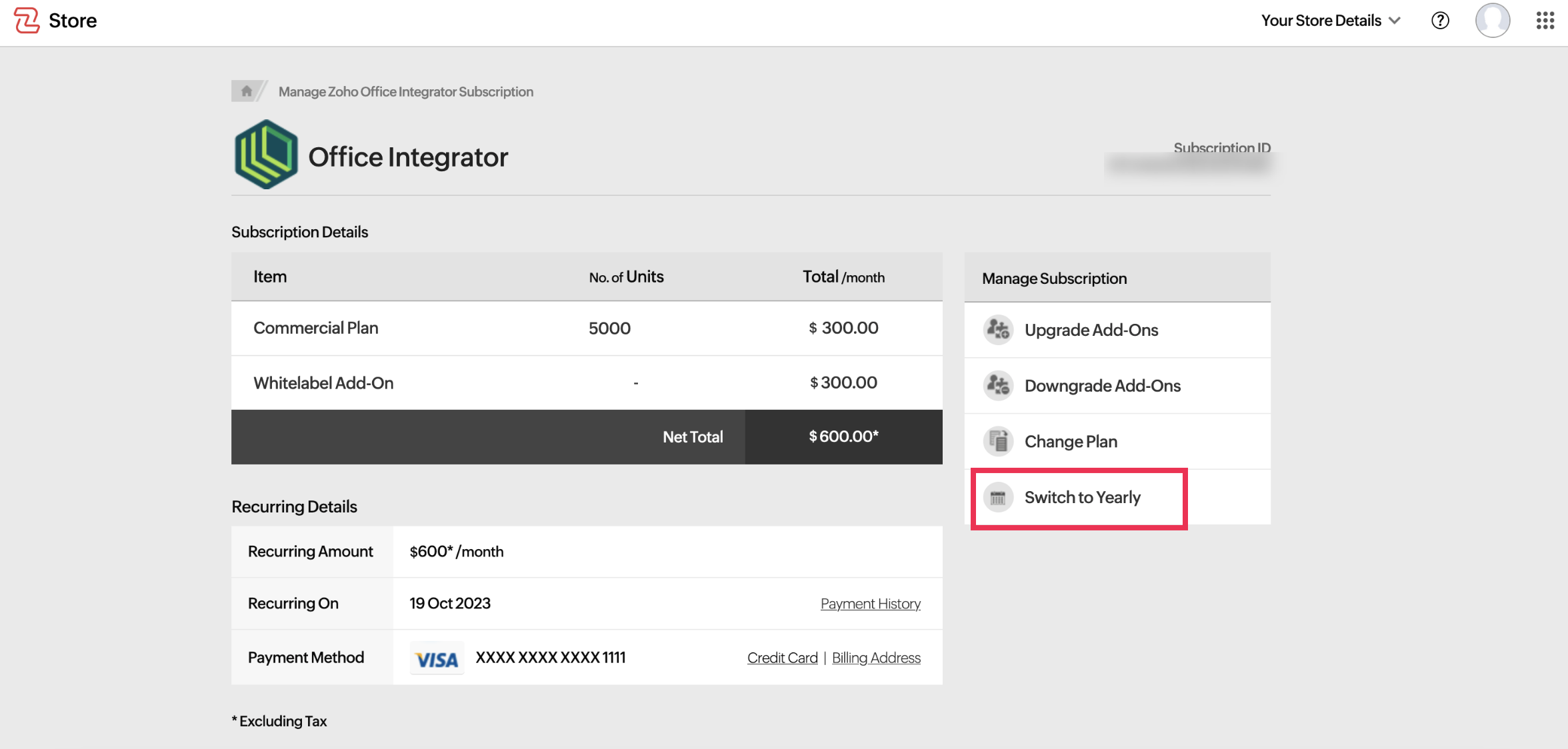 Go to Zoho Office Integrator Dashboard, click on Change Plan button. Click on Switch to Yearly option under Manage Subscription as shown below.