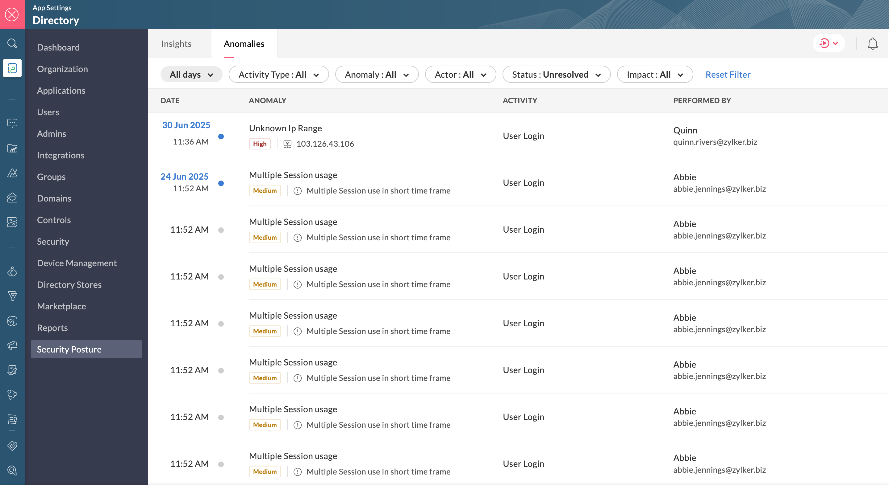 In the Anomalies tab, you can view and resolve the anomalies detected in the application. The list view displays anomalies with specific information such as the actor email, login details, activity details, and reasons for marking the activity as anomalous. For security reasons, admin users cannot resolve anomalous activities performed by the super admin or from their respective accounts.