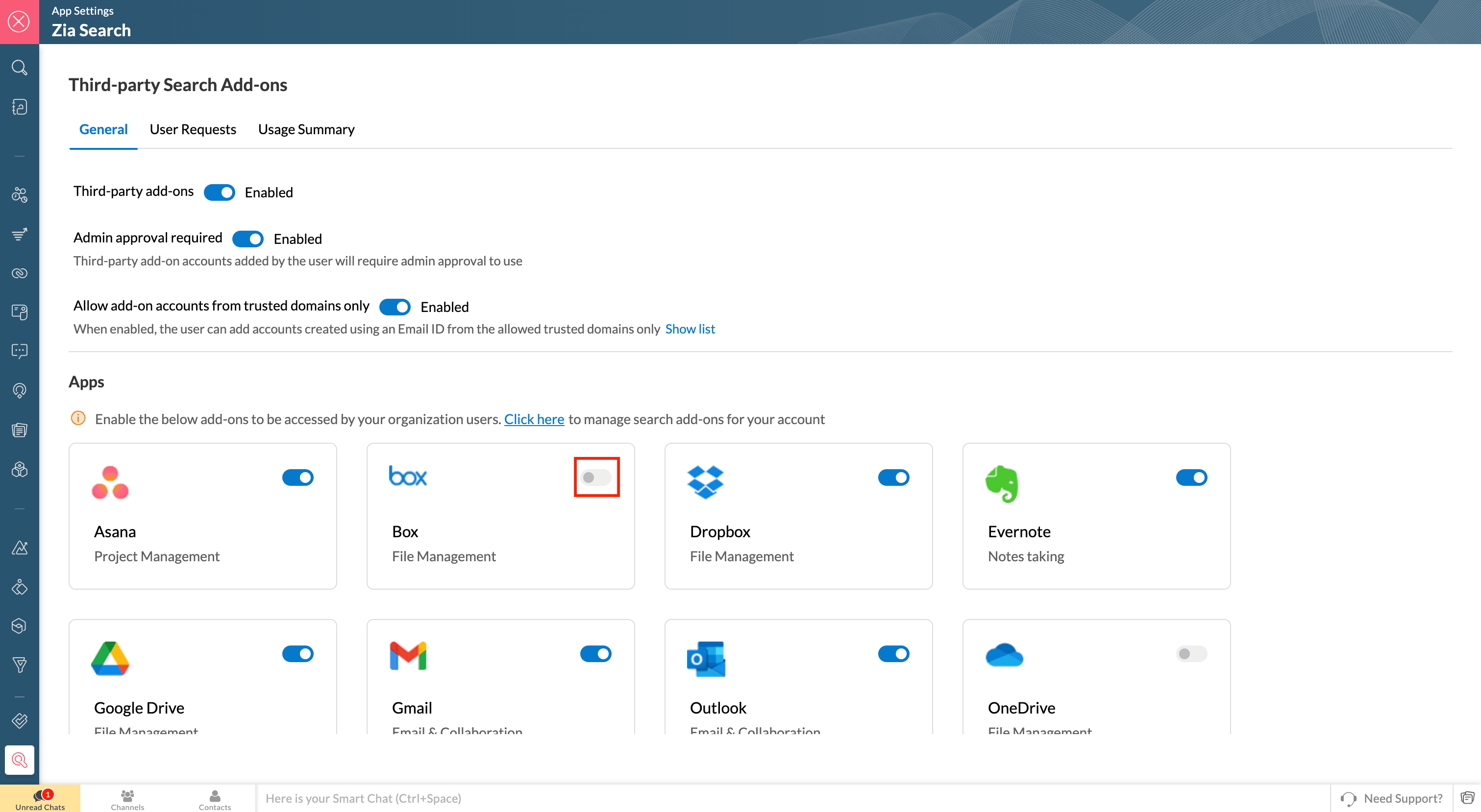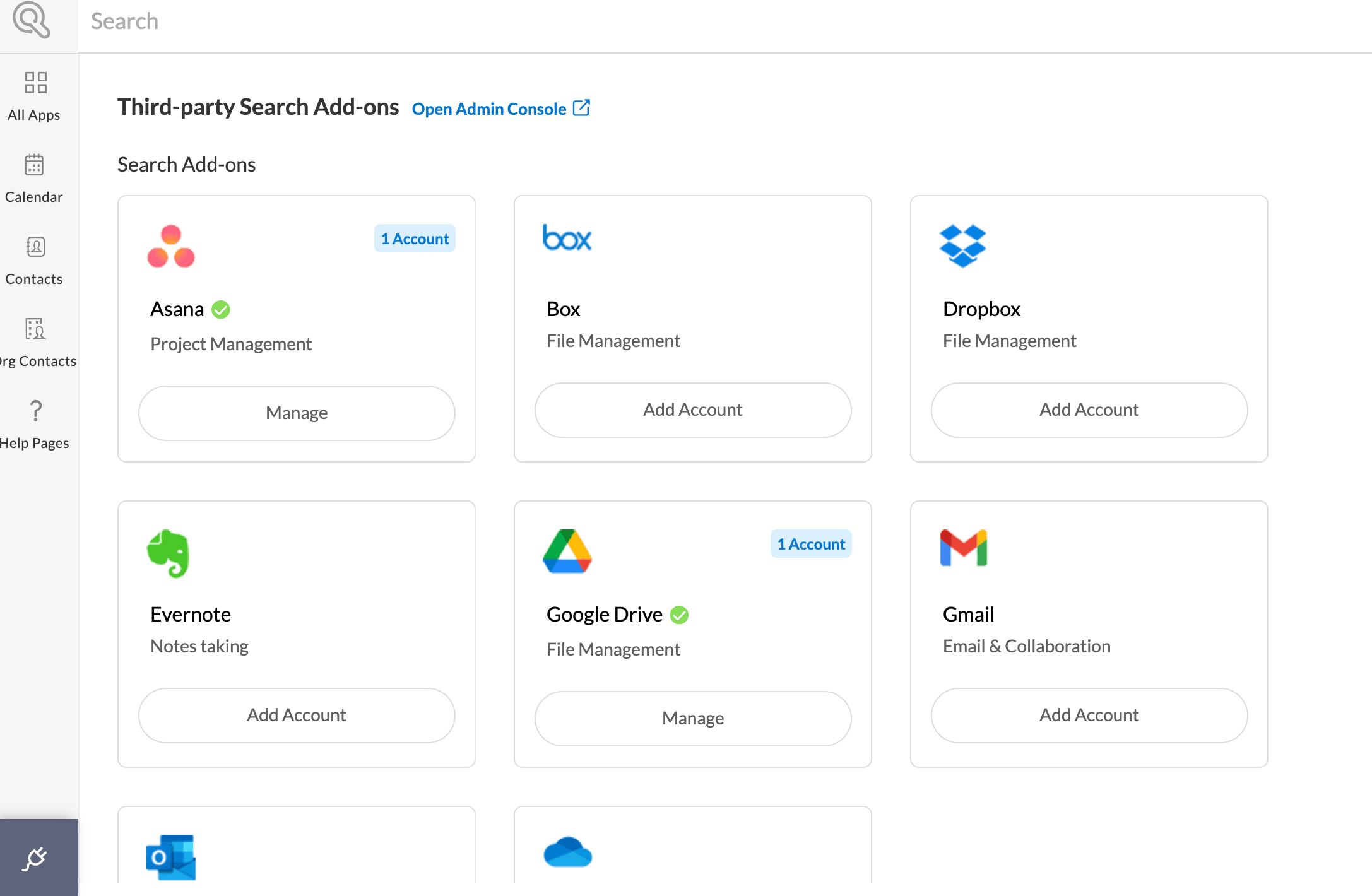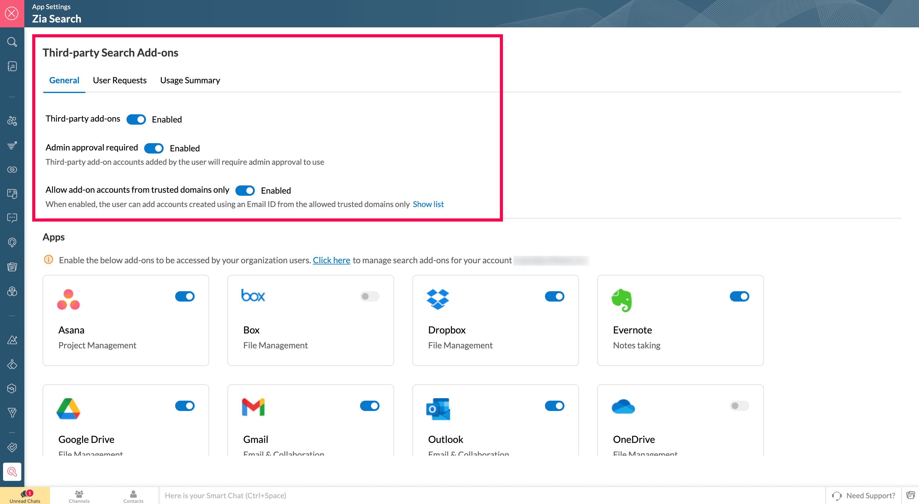 Zoho offers a cloud connector feature that allows you to link external apps with Zia, enabling you to search for information not only within Zoho applications but also across connected third-party apps.