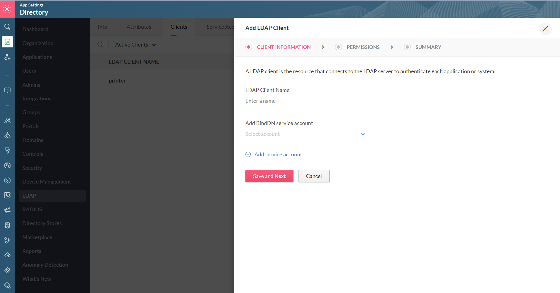 - Go to LDAP in the left panel, if not configured, click Configure LDAP. If already configured, click Add LDAP Client in the Clients tab.