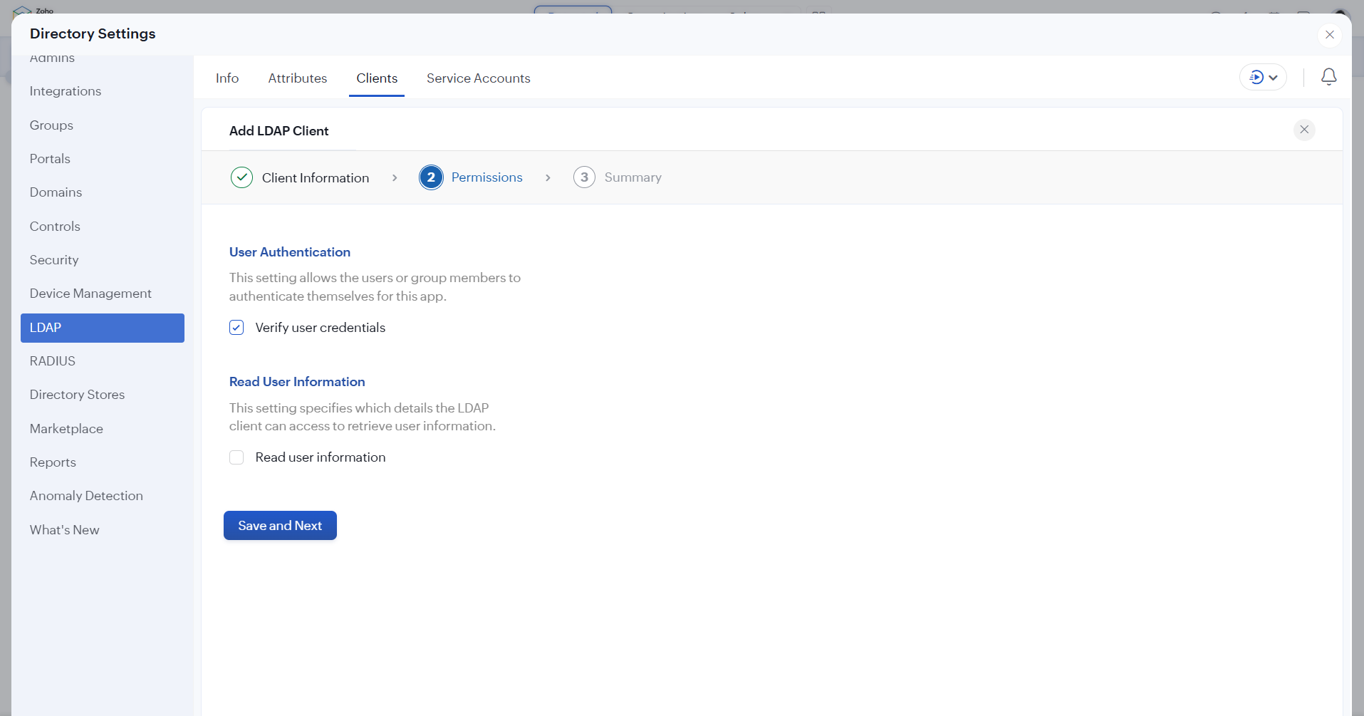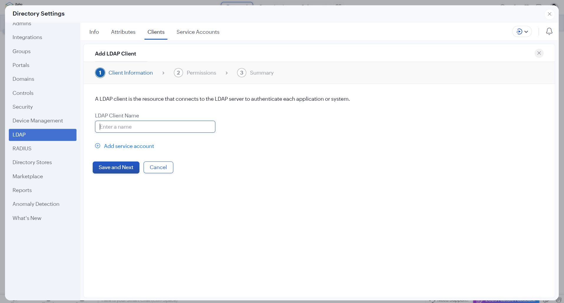 Username and password | For LDAP clients that require a username and password, use the username and saved password from when you created a service account while adding the LDAP client to Zoho One. |